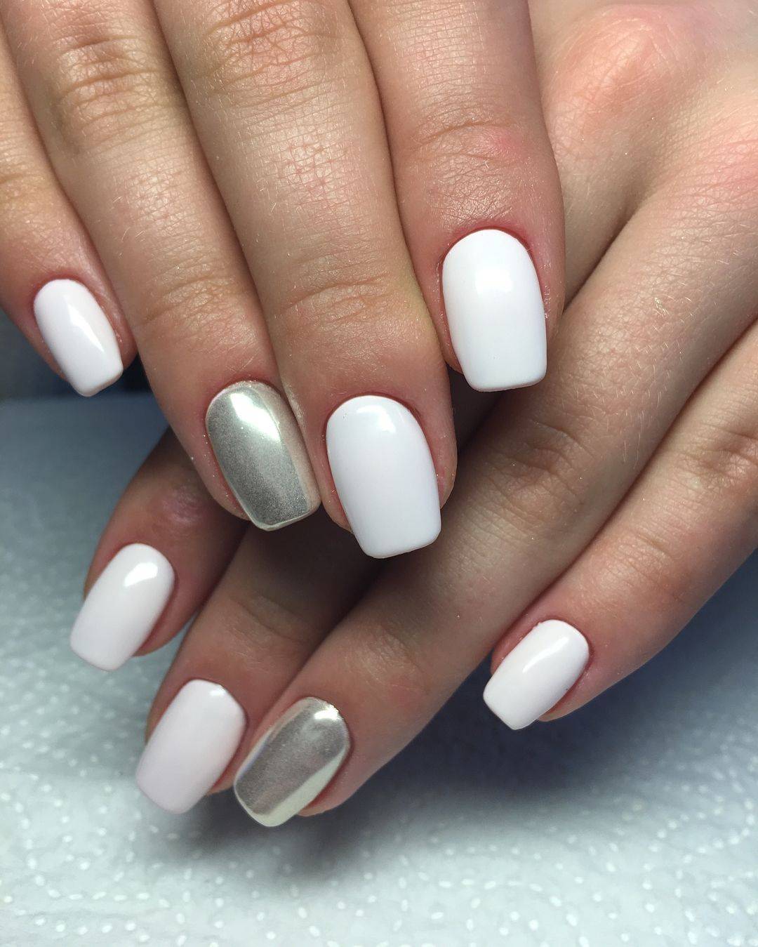 Белый маникюр с серебряным оттенком — это идеальное сочетание для торжественного мероприятия или вечернего выхода. Серебристый цвет прекрасно дополнит белый лак, придавая маникюру изысканность и блеск.