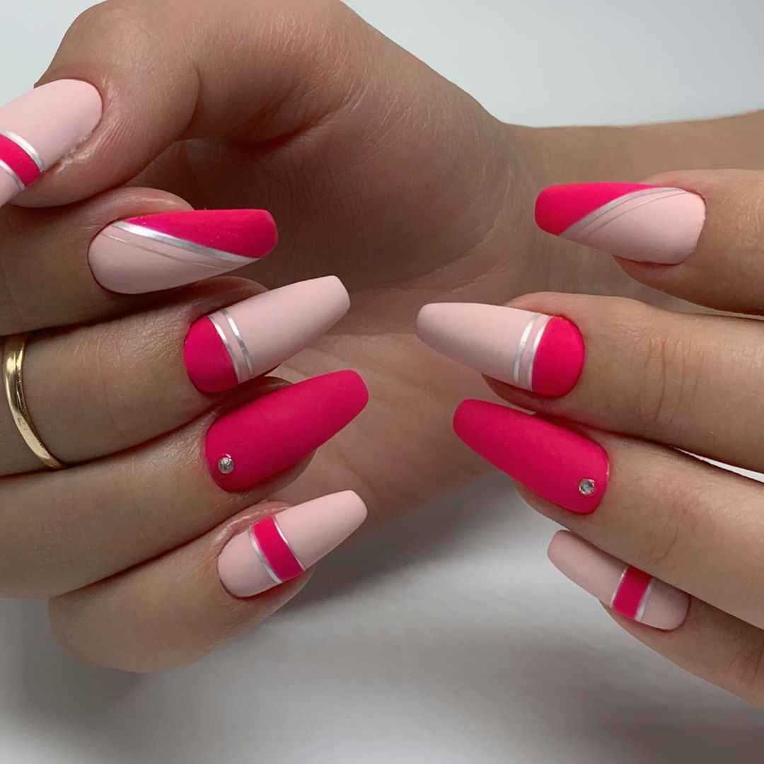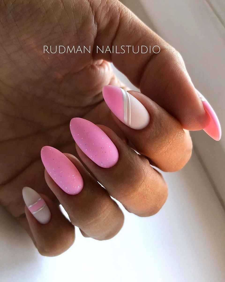 Асимметричный жакет вы вольны разбавить практически любым цветом при условии, что они будут сочетаться с основным розовым. Также не забывайте, что качественно выполнить эту технику сможет только специалист с большим опытом, иначе можно получить несколько неаккуратный маникюр с неточными линиями и углами.