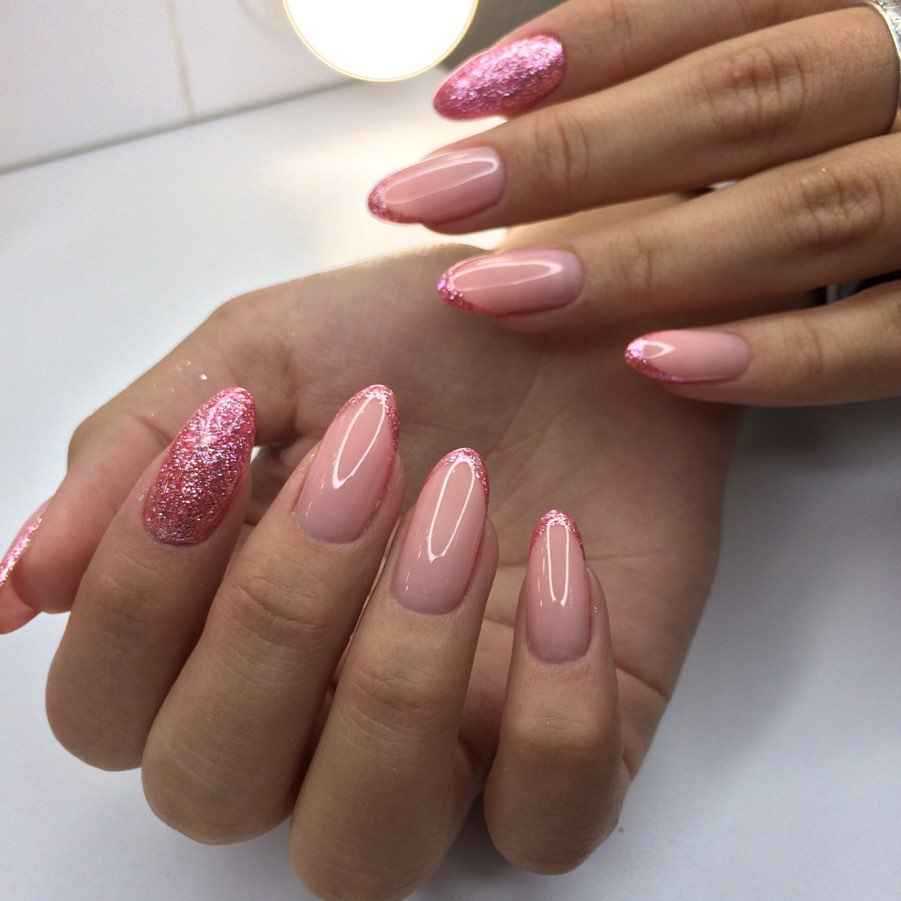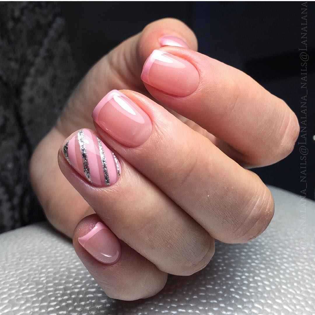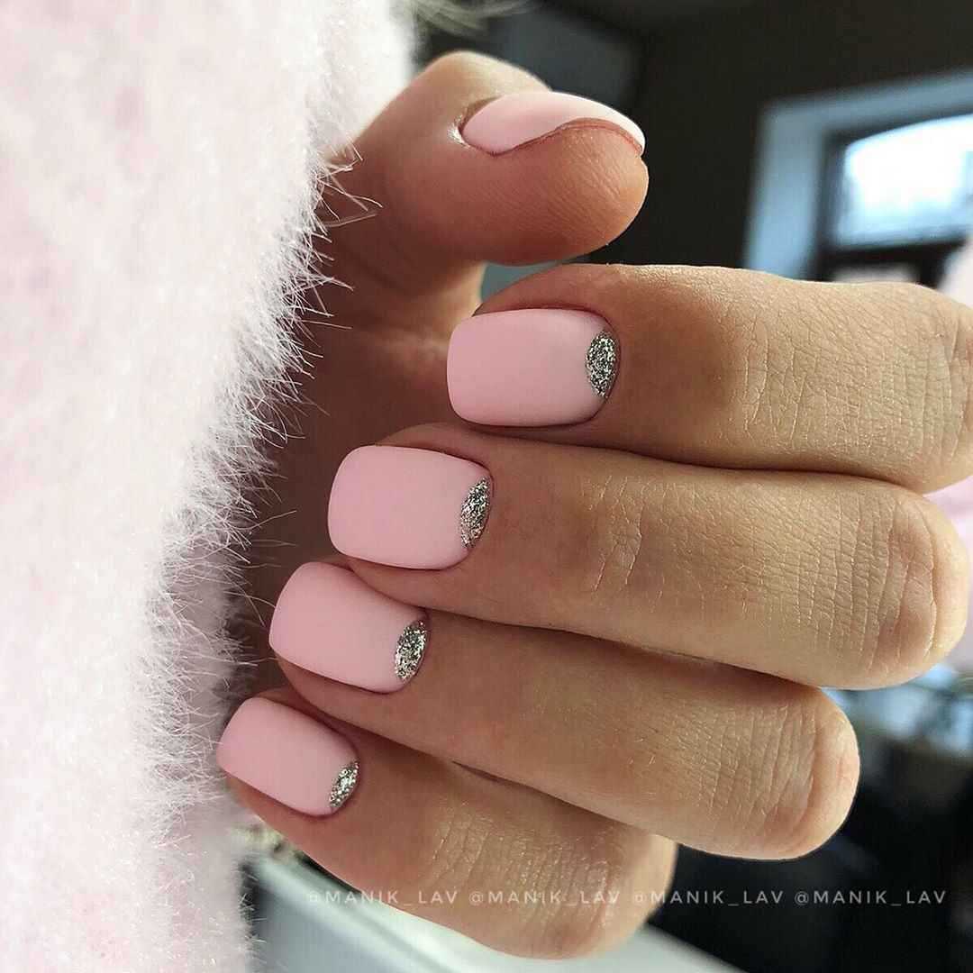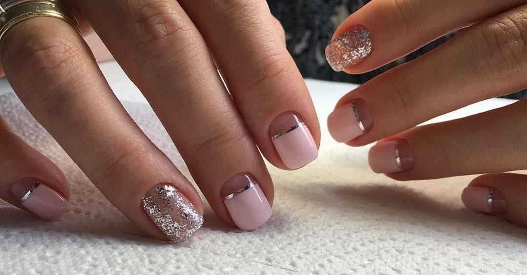 Разнообразный маникюр в розовых тонах в качестве фона идеально сочетается с серебристым лаком. Украшение базового покрытия происходит после выбора насыщенности цвета. Если пластина окрашена в яркий лак, то глиттер должен быть мелкой фракции. При таком подходе рисунок выразительно выделяется на ярком полимере.