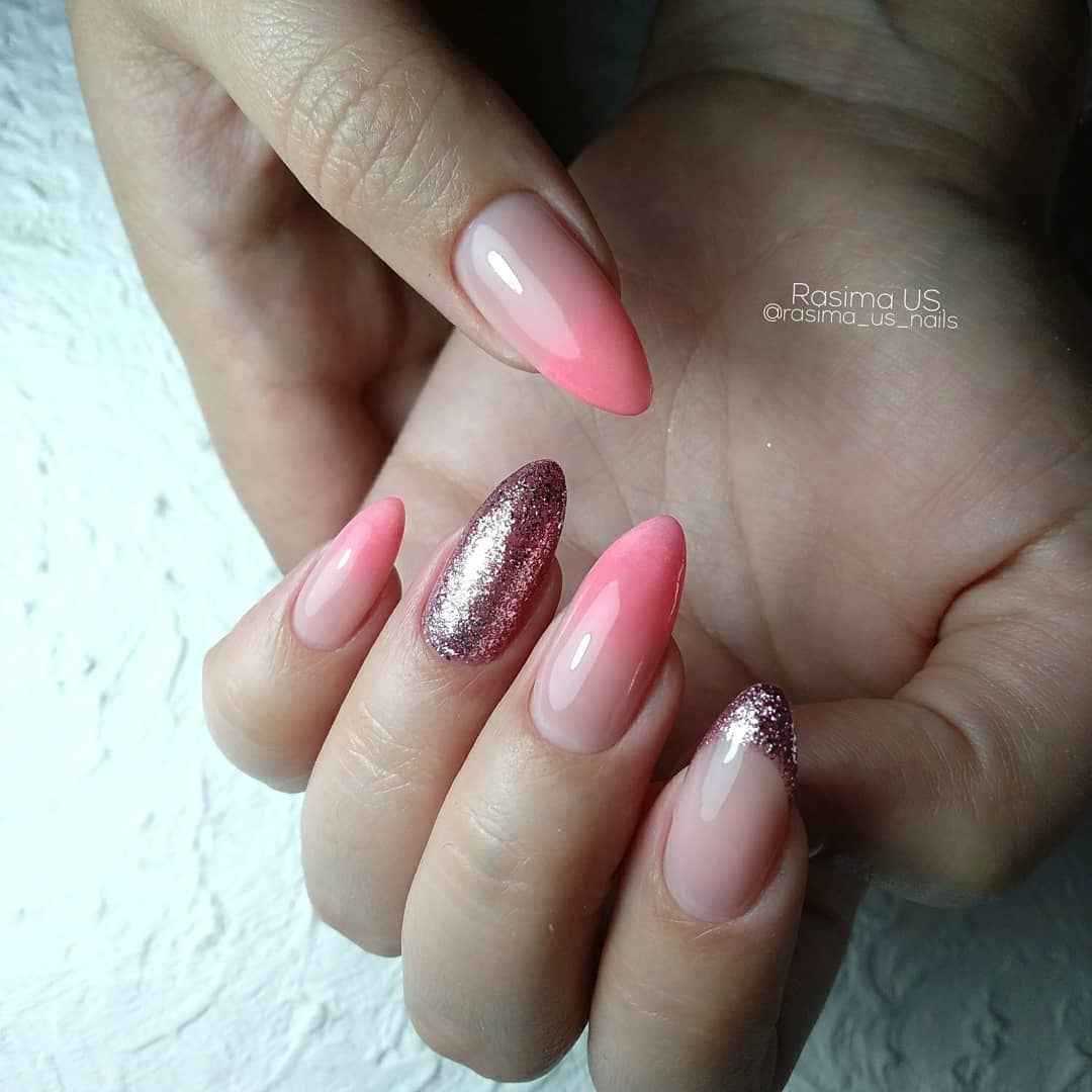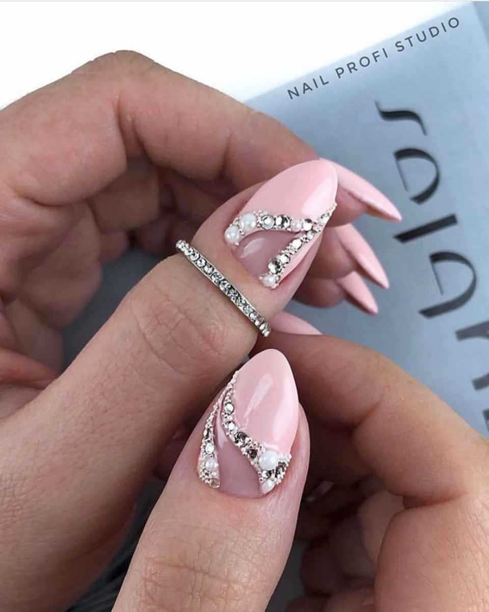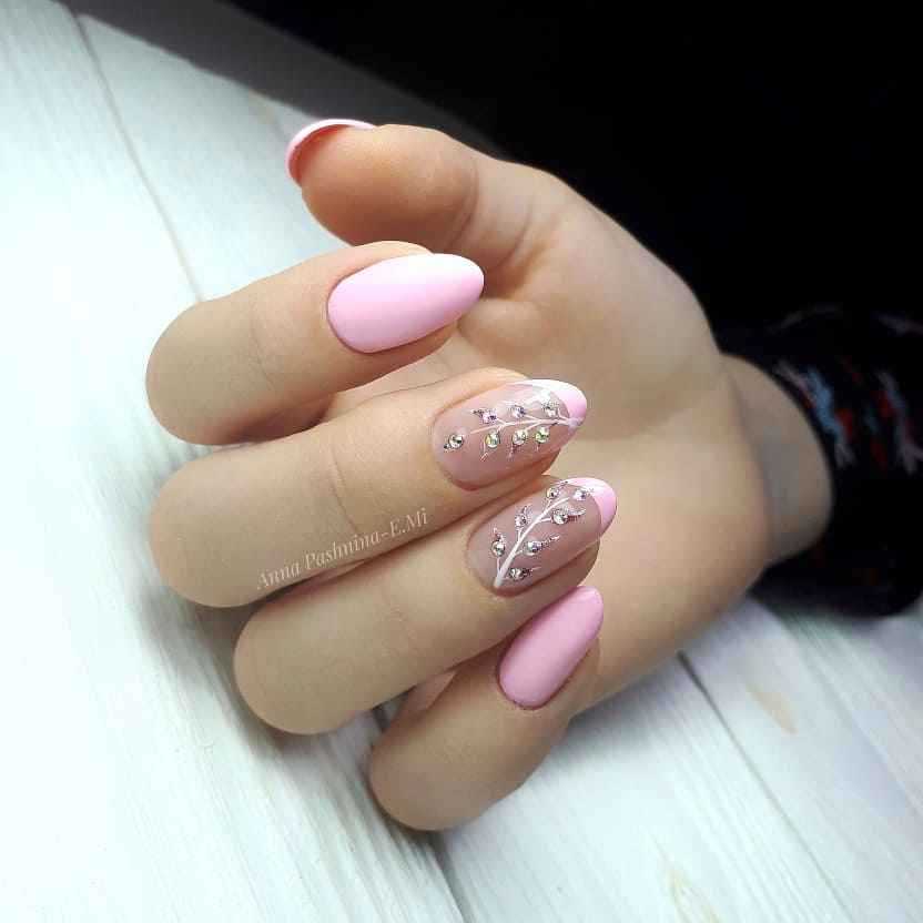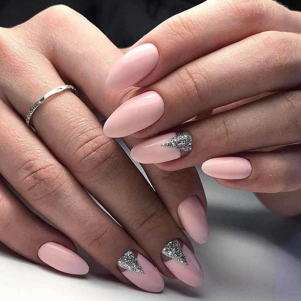 Разнообразный маникюр в розовых тонах в качестве фона идеально сочетается с серебристым лаком. Украшение базового покрытия происходит после выбора насыщенности цвета. Если пластина окрашена в яркий лак, то глиттер должен быть мелкой фракции. При таком подходе рисунок выразительно выделяется на ярком полимере.