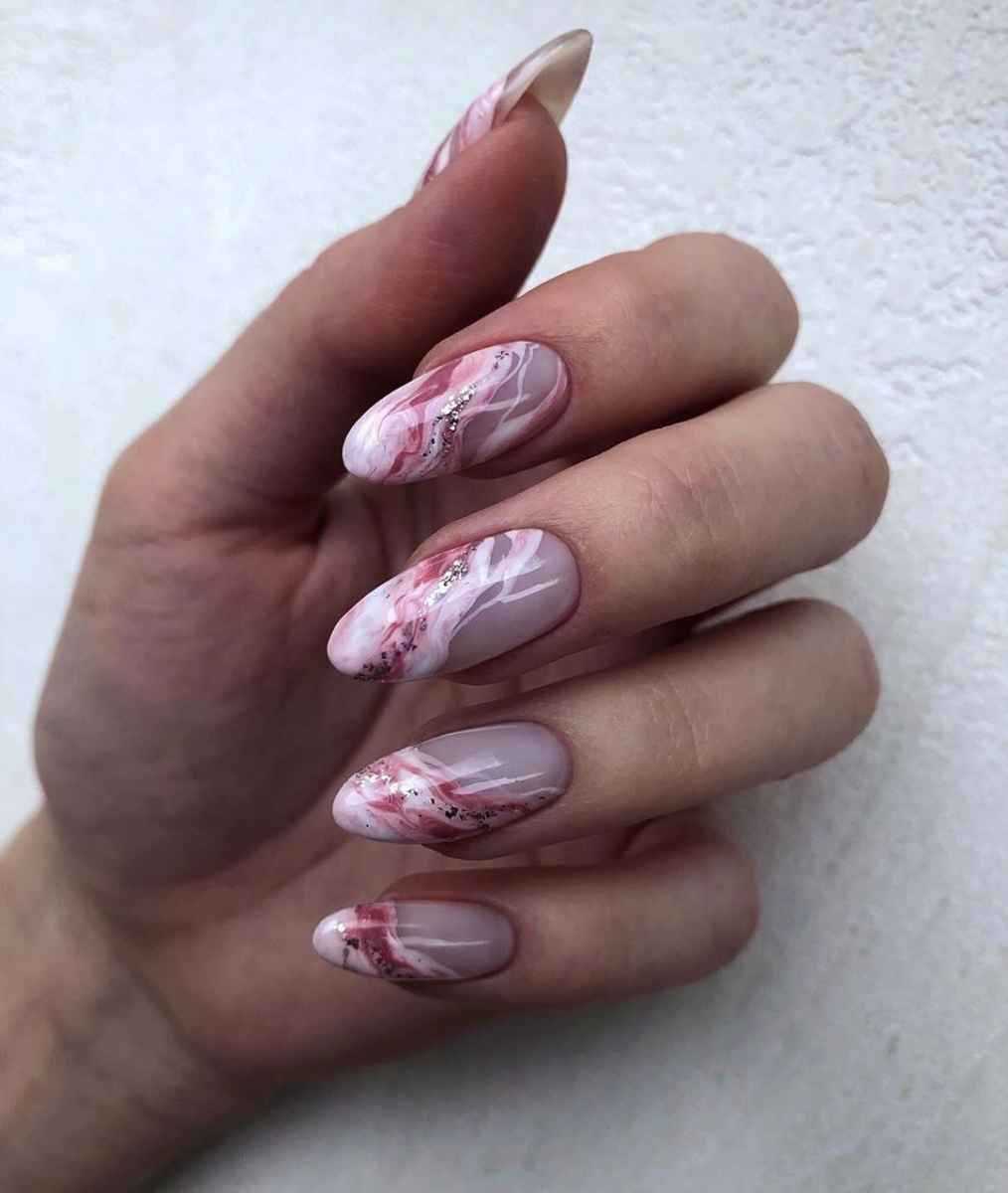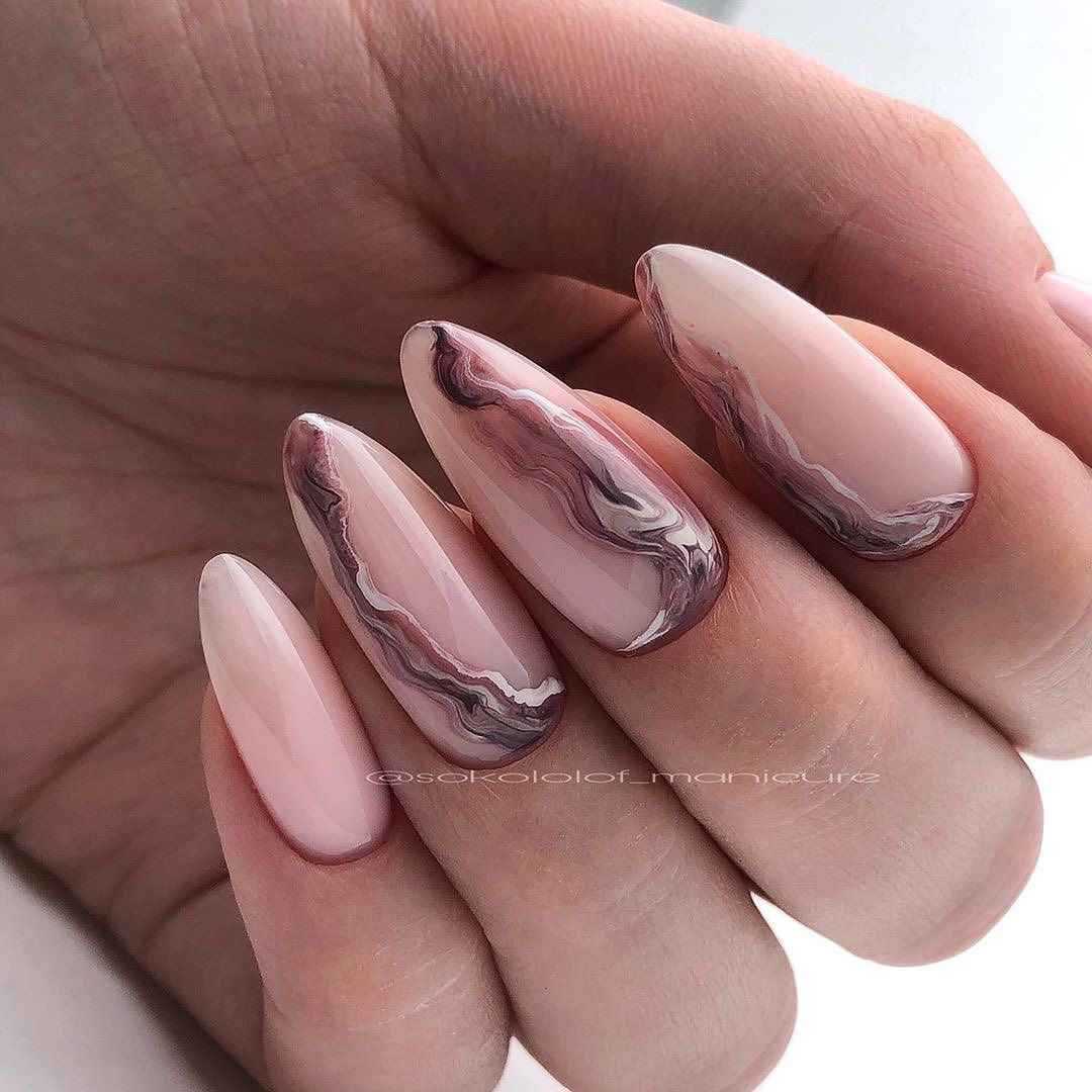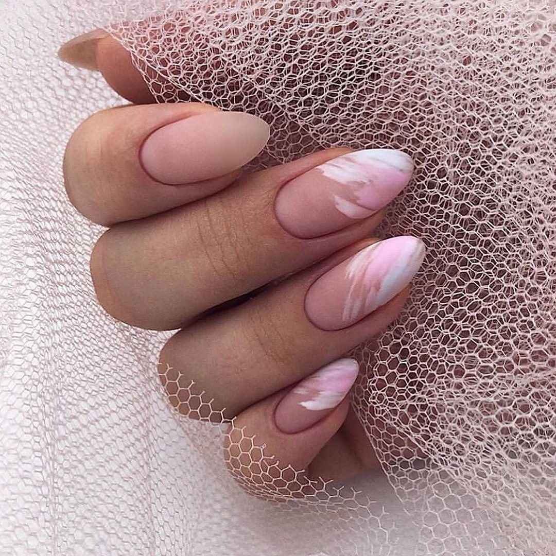 Нежные миндальные ногти украшают нюдовым френчем, особый шарм которому придает форма. В качестве акцента хорош мрамор, а однотонный пастельный финиш прекрасно освежают мерцающие светоотражающие частички.