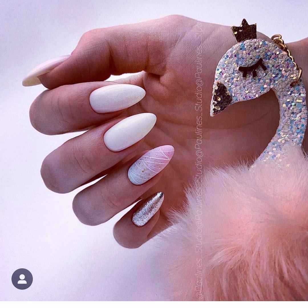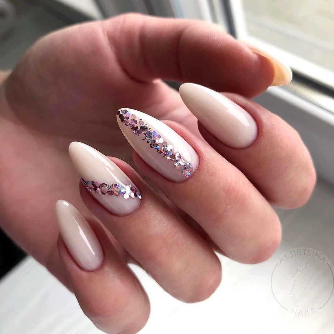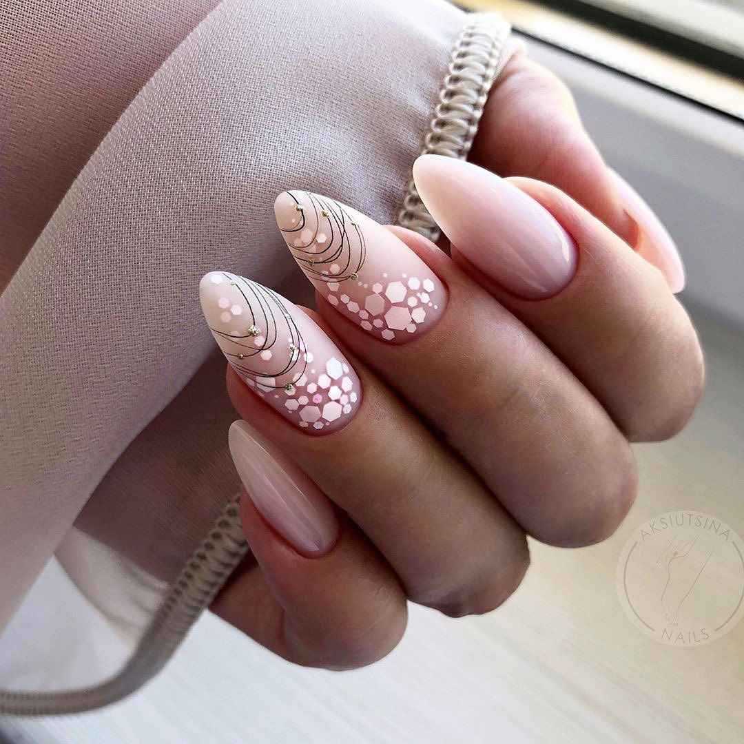 Нежные миндальные ногти украшают нюдовым френчем, особый шарм которому придает форма. В качестве акцента хорош мрамор, а однотонный пастельный финиш прекрасно освежают мерцающие светоотражающие частички.