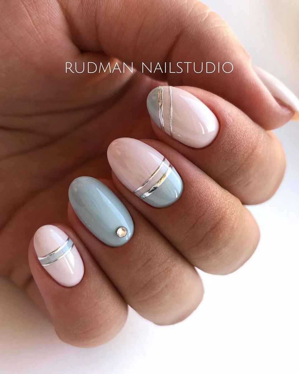 Разбавить ассиметричный маникюр можно геометрическими узорами, тематическими узорами и даже украшениями. Если говорить о последних, то с представленной техникой более гармонично работают фольга, стразы, бульоны и даже наклейки.