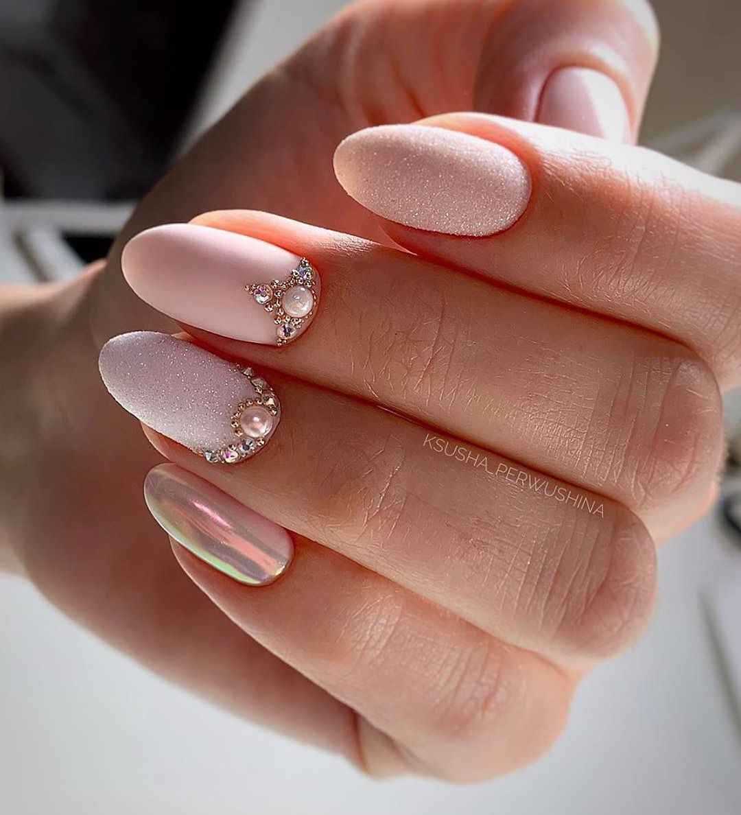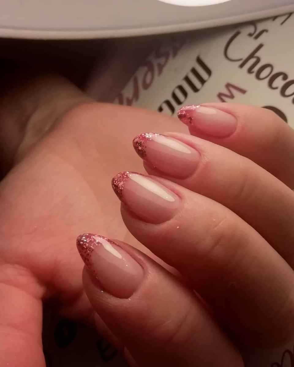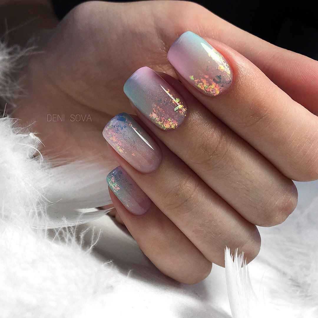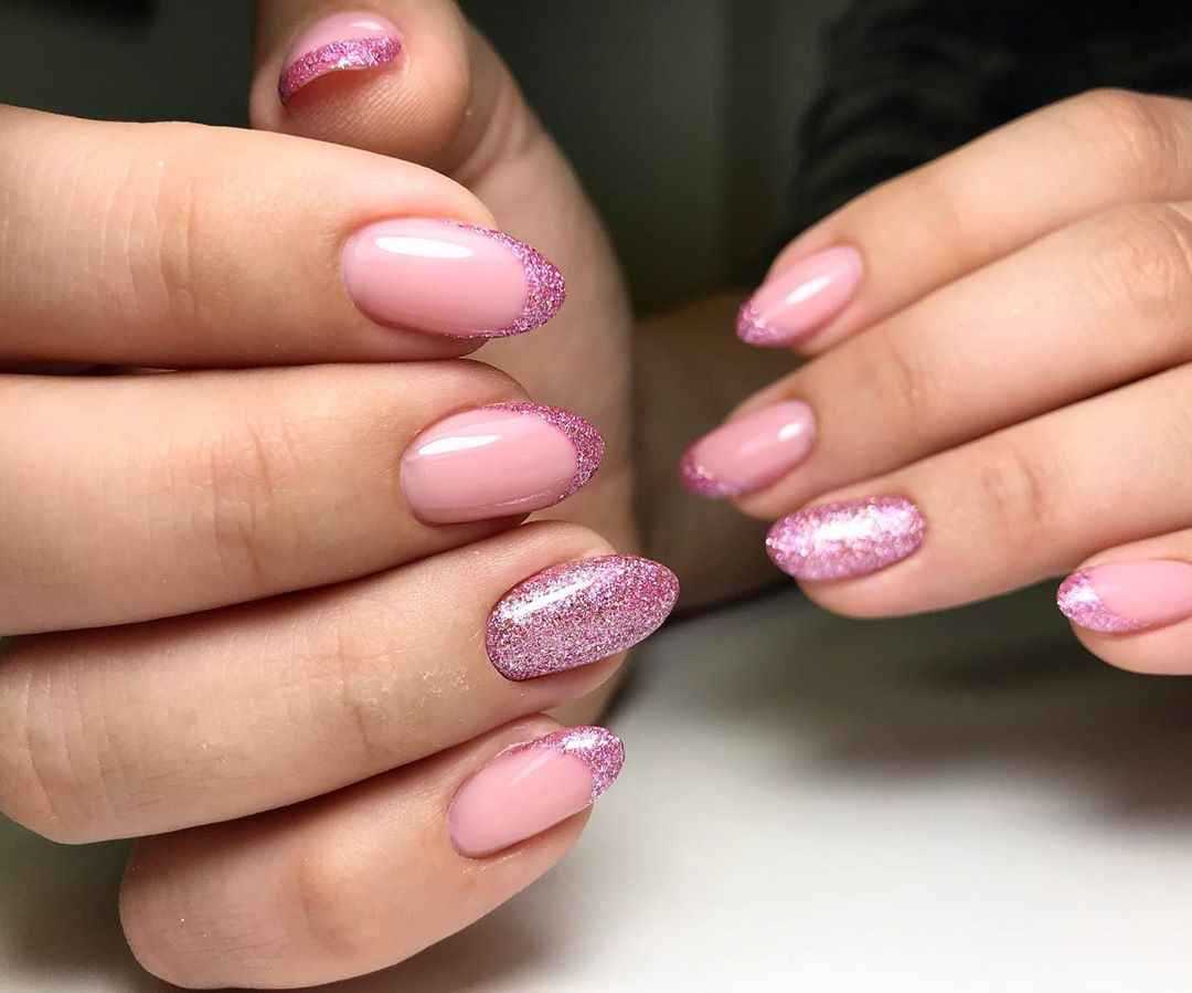 И, конечно же, мастера не могли не нанести их на нежно-розовый френч. К тому же цвет этих блесток далеко не всегда розовый, но при этом каждый из вариантов выглядит свежо и очень привлекательно.
