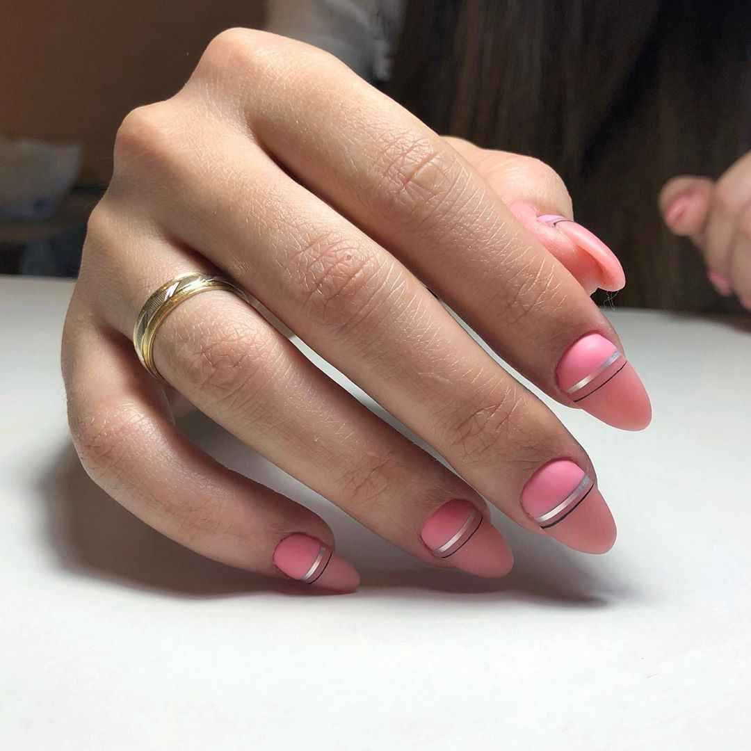 Также на ногти можно сделать асимметричный розовый френч. Эта идея отлично подойдет как для длинных, так и для коротких ногтей. К тому же представленный вариант дизайна выглядит невероятно стильно, современно и лаконично, что позволяет использовать его не только в повседневных и вечерних образах, но и в деловых.
