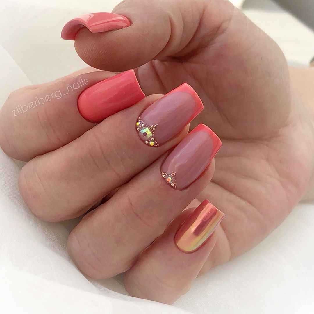 С розовым можно использовать следующие оттенки (для формы и длины ногтей): бронзовый, синий, красный, фиолетовый, бордовый, зеленый. Разрешается использовать различные декоративные элементы для придания эксклюзивности и уникальности.