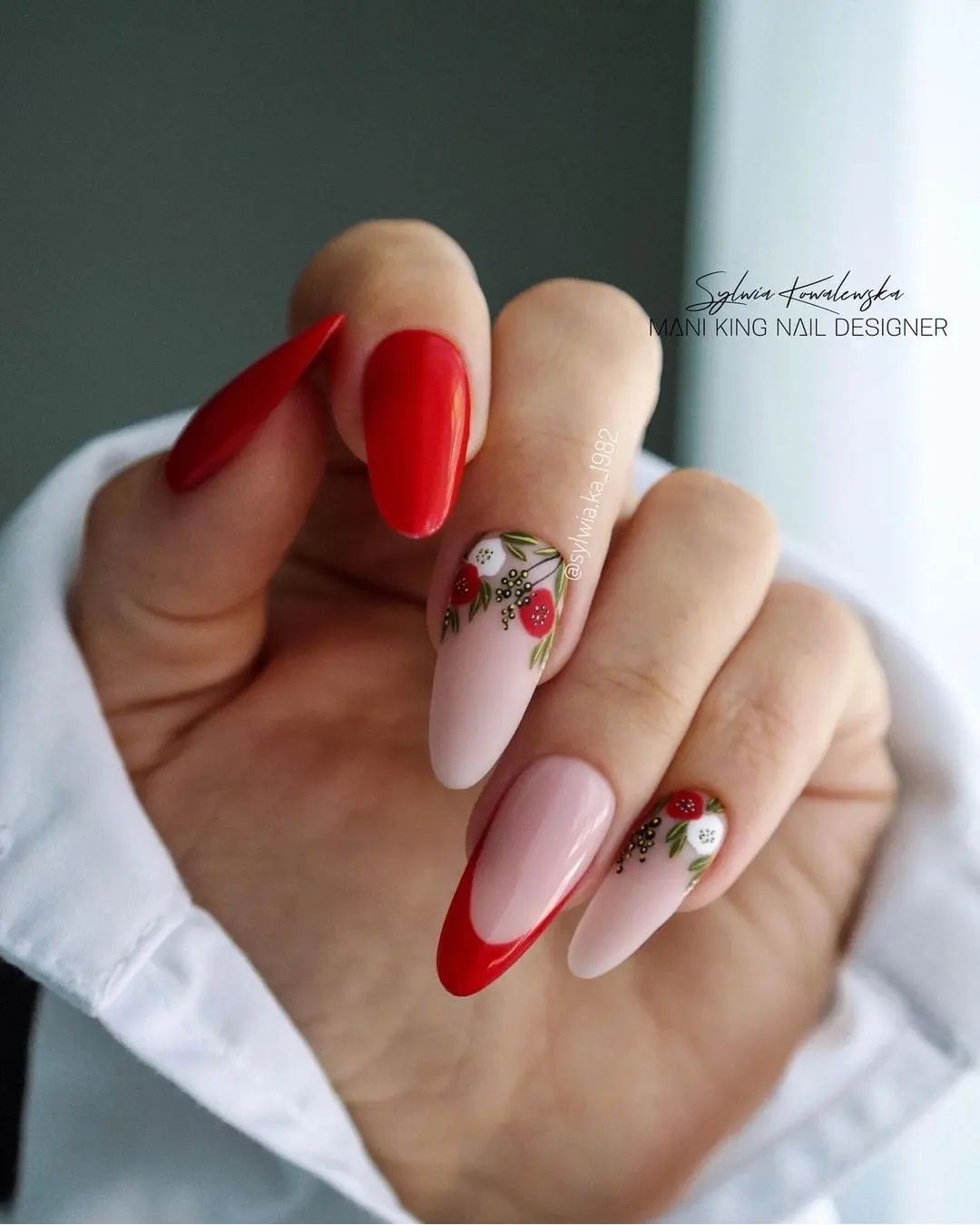 Красный френч или френч с элементами красного создает уникальный дизайн маникюра. Он страстный, яркий и необычайно притягательный. Красный красиво сочетается с черным, белым, золотом, серебром, фиолетовым, желтым и зеленым. Мастера часто используют его для создания рисунков цветов, которые могут быть переходящими.
