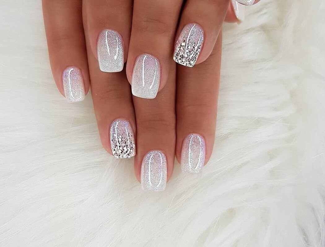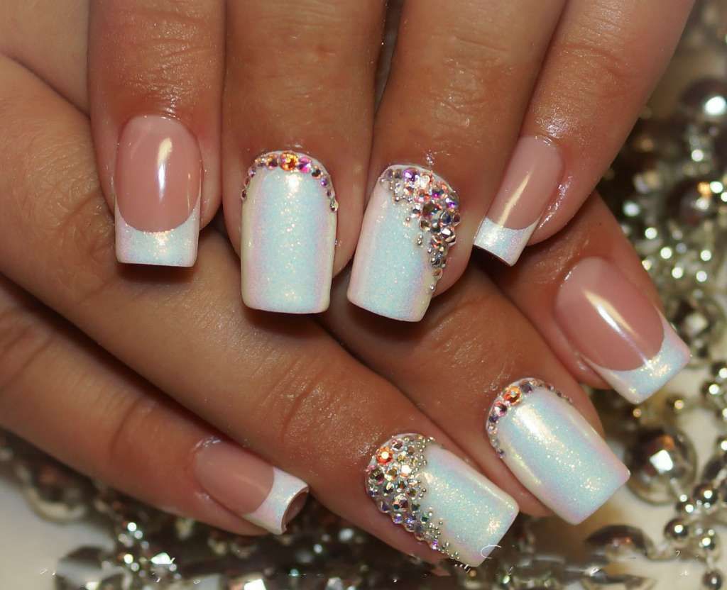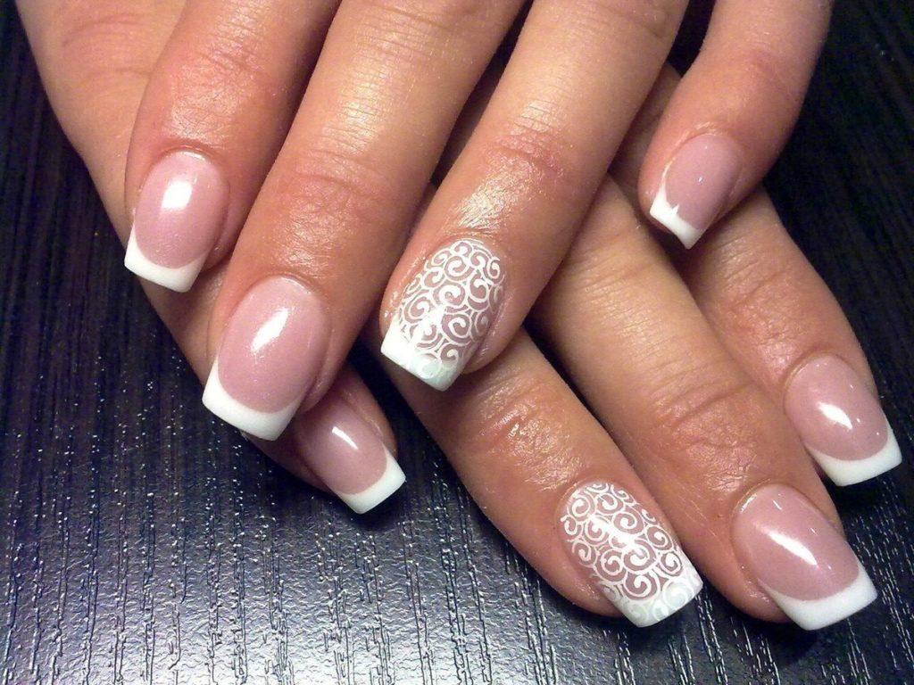Без белого тона не обойтись в классическом французском дизайне, пригодится он и для прорисовывания линий праздничного покрытия. Даже обычный френч с белыми полосками можно превратить в торжественный, дополнив сияющим декором.