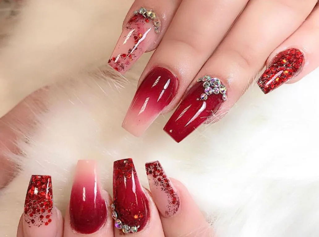 Красный оттенок – один из основных новогодних тонов, как и зелёный – цвет праздничной ёлки. Оба они шикарно комбинируются со стразами, блёстками и серебряным декором.