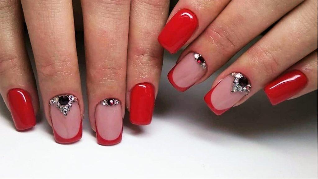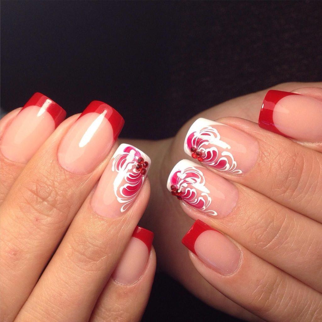 Что касается покрытия в красном цвете, то его чаще всего выбирают для посещения мероприятий. Столь яркий френч можно дополнить дизайном в виде абстракции, кружева, геометрии или цветочного рисунка. Каждый из них по-своему хорошо украшает классику. Дополнительный декор в данном случае все также уместен. Поскольку многое зависит от размера блесток и их количества. Цвет таких деталей лучше выбирать исходя из наряда, который вы планируете надеть на торжество. Наибольшей популярностью пользуются золотистые и серебристые блестки. Считается, что они всегда будут уместными.