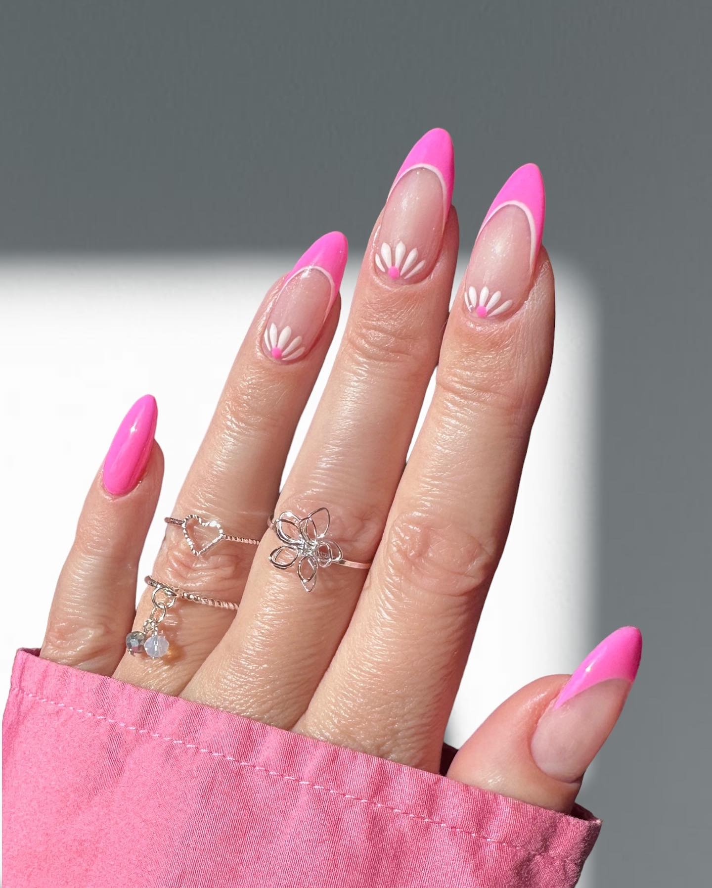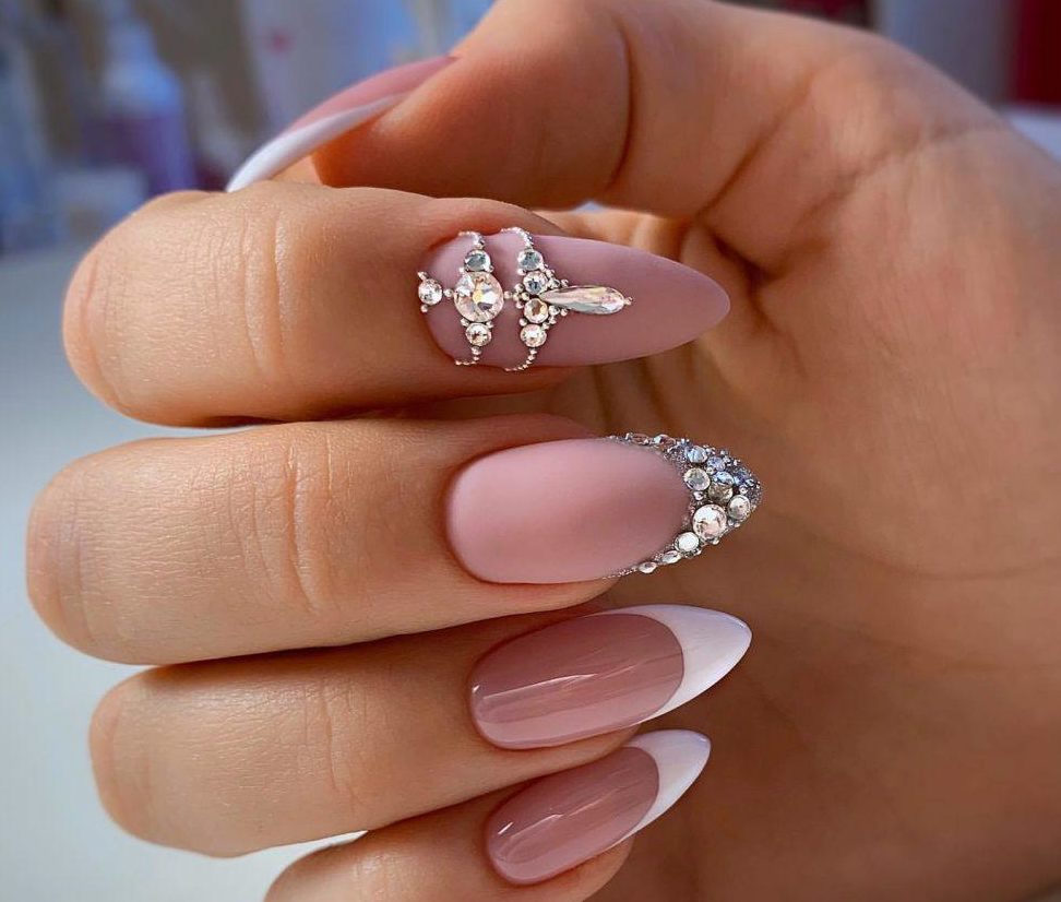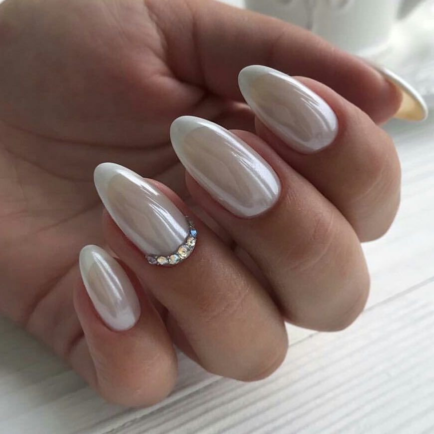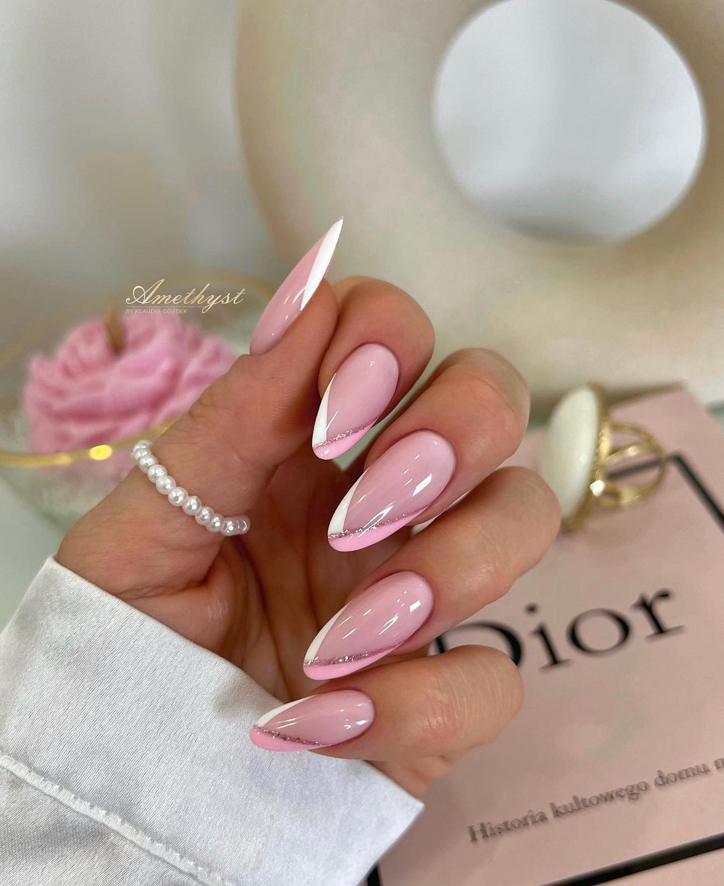 А вот миндалевидные ноготки всегда прибавляют пальчикам длины. В этом случае вы можете экспериментировать с различными трендами, формами и цветом френча.