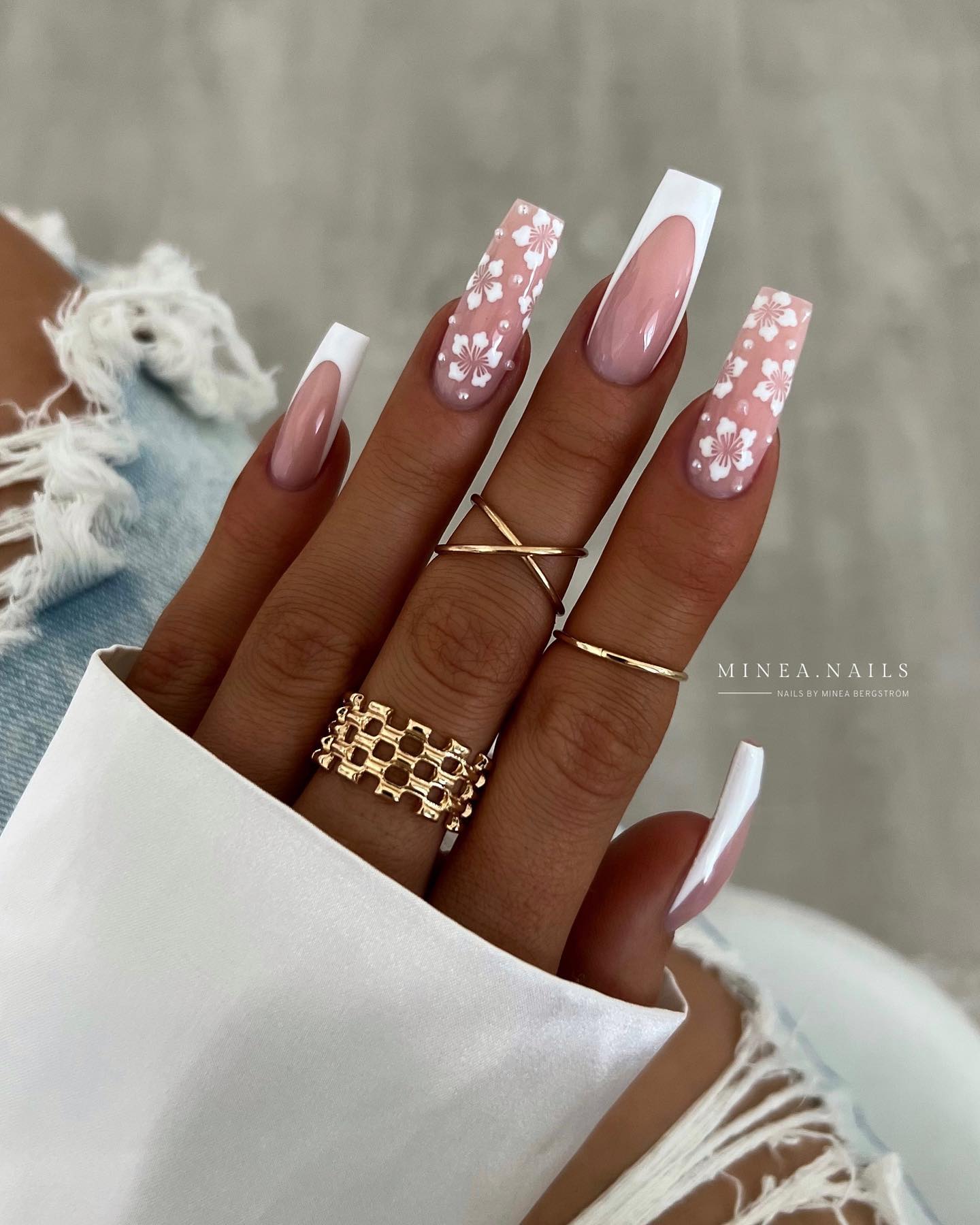 Самым популярным рисунком для френча считаются цветы. Цветы могут украшать один или два ноготка, присутствовать сразу на всех, либо идти переходящим вариантом. Их цвет будет зависеть от цвета покрытия самого ногтя, что по итогу создает гармоничное сочетание. Бутончики цветов дополнительно украшают блестками или стразами.