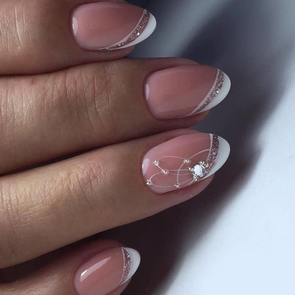 Бежевые и розоватые тона идеальны для френча, который планируется носить и после праздников. Его можно украсить стразами или декором в технике омбре.