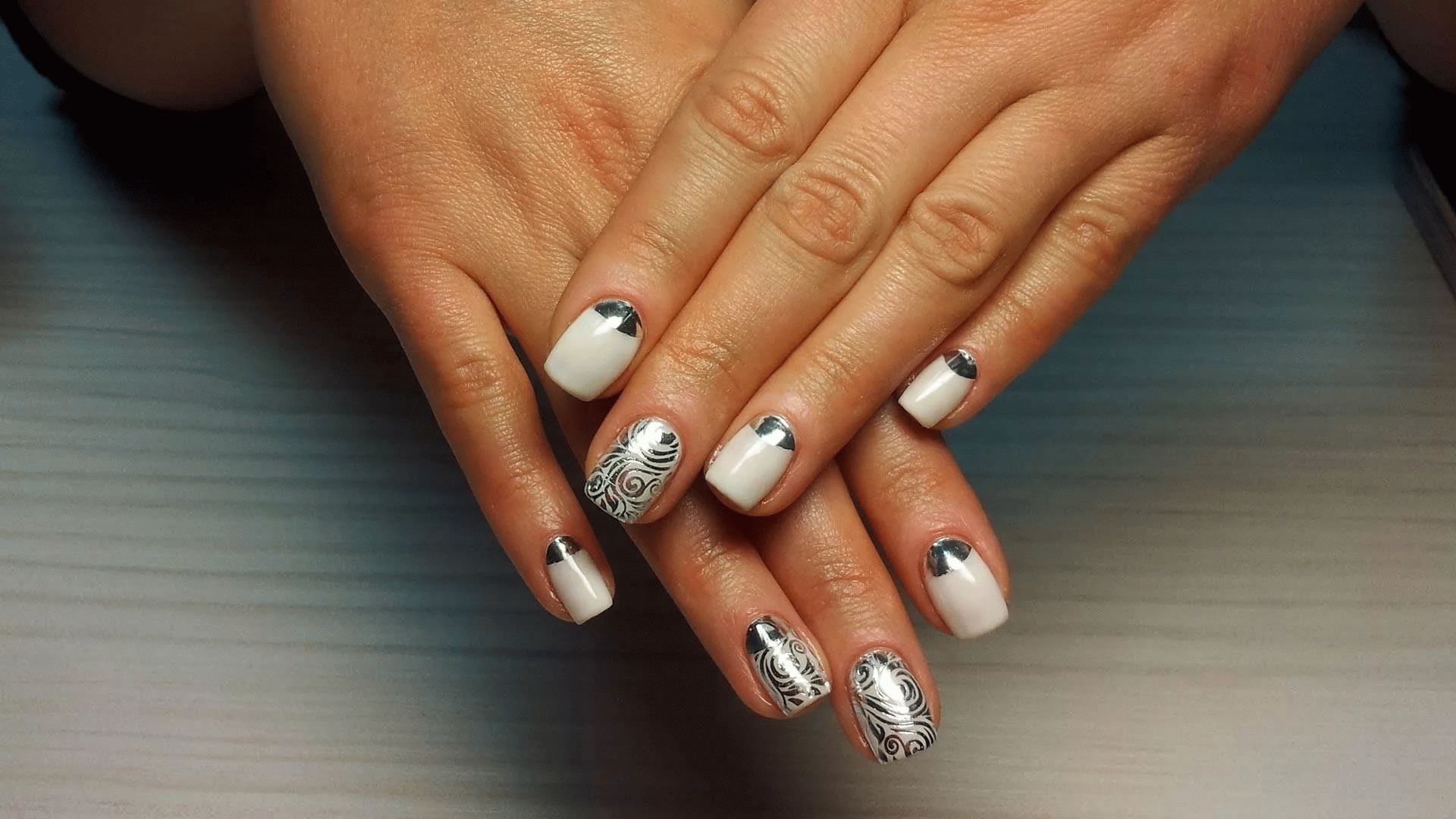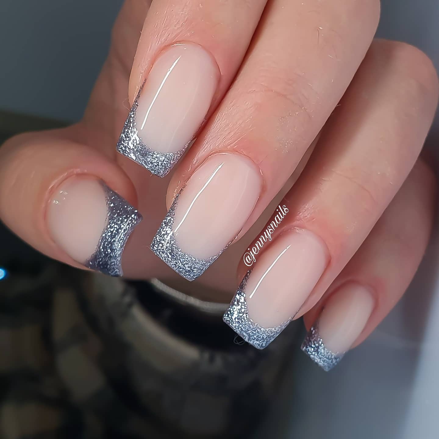 Еще один вариант универсального цвета — серебро, подойдет для создания холодного праздничного варианта френча. Серебро наноситься в качестве цвета на зону улыбки, может использоваться в виде декора, украшения либо рисунка.