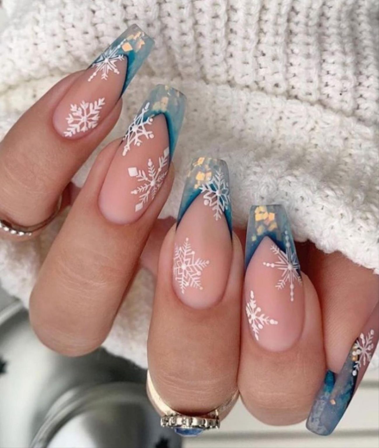 Лучше всего синие кончики ногтей сочетаются с голубой основой или нюдовыми покрытиями. Они уравновесят яркий тон, сделают его более спокойным. Дополнить зимнюю тематику можно «изморозью» акриловой пудры.