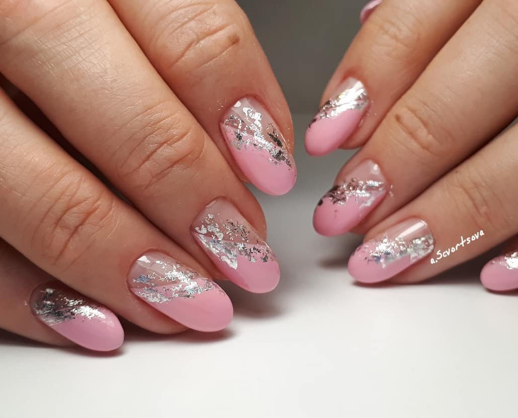 Серебро само по себе украшает французский маникюр, и этому оттенку даже не нужен дополнительный декор. Можно просто выполнить серебряный френч на нежно-голубом или розовом фоне. Более продвинутый вариант украшения ноготков – рисование снежинок или звёздочек.