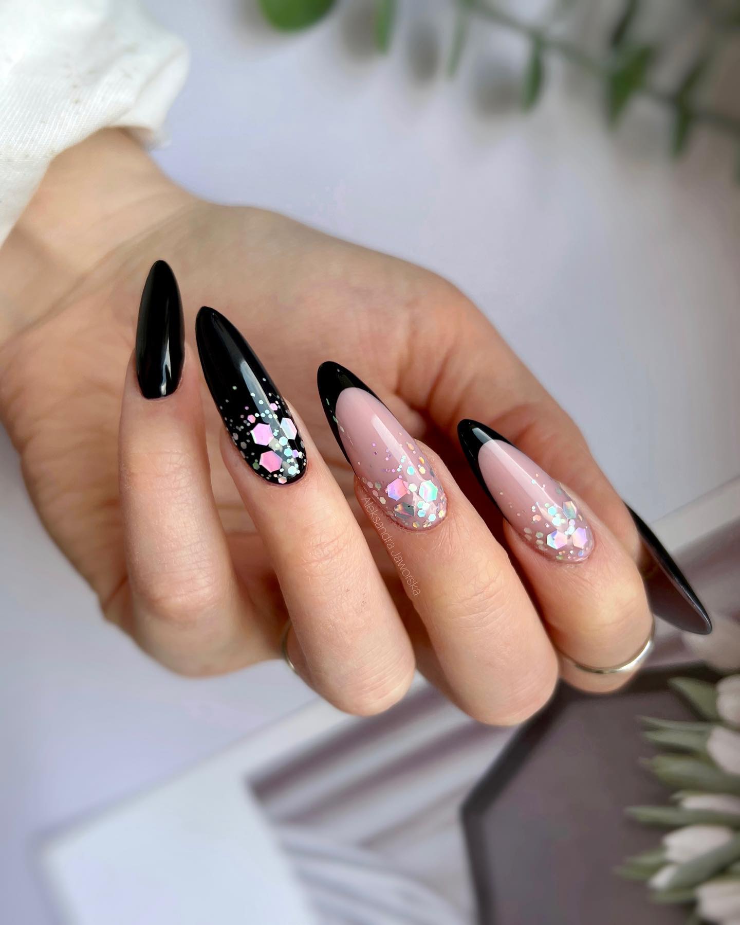 Этот цвет можно применять для прорисовывания лунок, полукругов на ногтях, а также в качестве основного тона для блёсток. Без злоупотребления по количеству он точно не будет выглядеть мрачно.