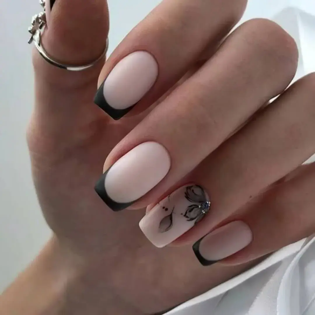 Нюдовый цвет ногтей создает естественный и минималистичный стиль, а добавление черных кончиков сделает ваш френч модным дополнением вашего образа в 2024 году. Этот дизайн создает шикарный, женственный и элегантный вид, который притягивает взгляды окружающих.