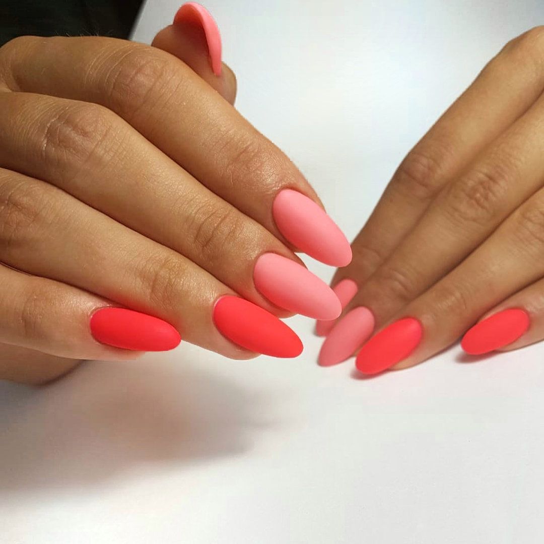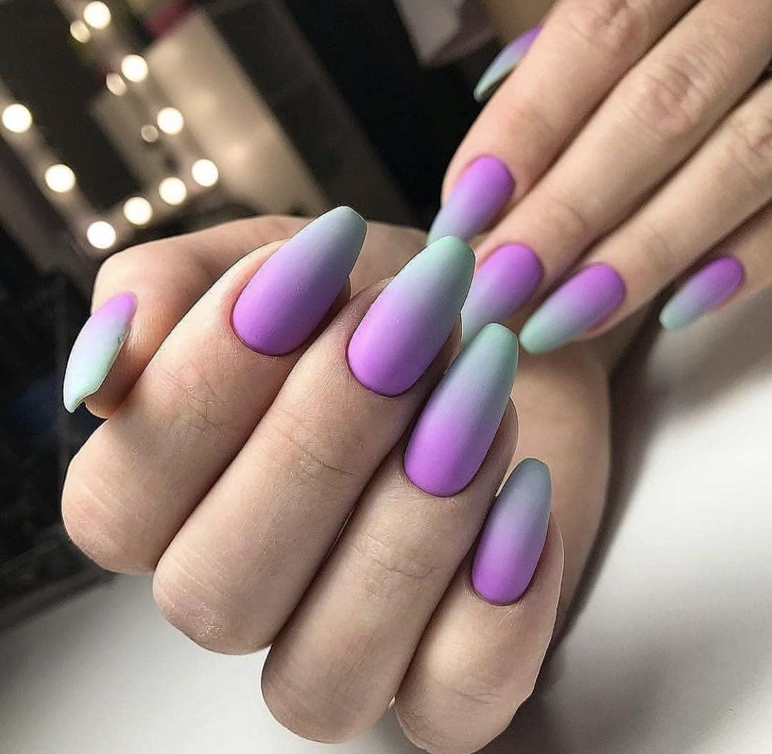 Матовые двухцветные ногти с переходом цвета – смелое решение, которое отразит вашу индивидуальность и непредсказуемость. Кроме того, матовое покрытие слегка смягчит яркость цвета, поэтому если вы хотите ногти пудрового оттенка, то берите изначальный цвет на тон-два темнее.