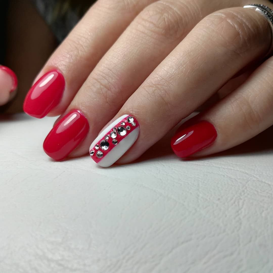 Стразами можно также украсить новогодний французский маникюр, выполненный в ярких оттенках.