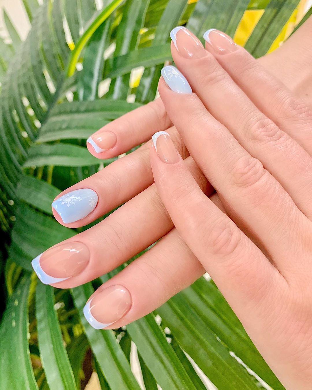 Нежный голубой французский маникюр украсит ваши ногти в любое время года, но по-особенному прекрасно он смотрится в весенне-летнее время.