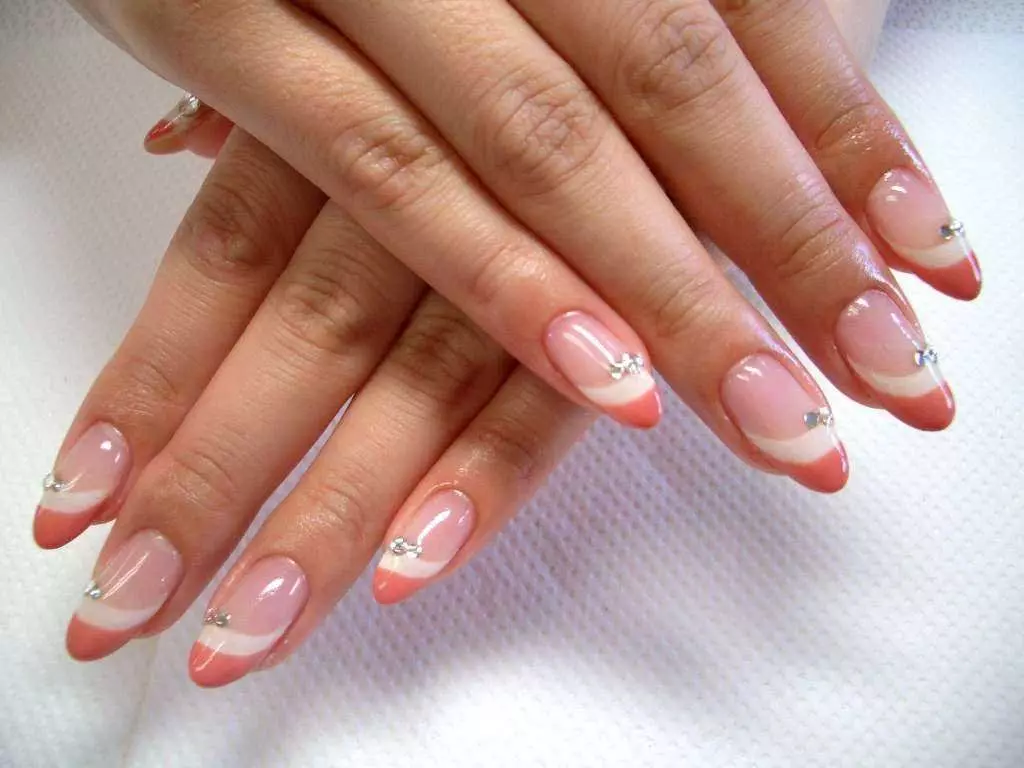 Красивый и изящный френч можно сделать путём украшения классического покрытия декором из стразов. Чтобы ноготки не выглядели вычурно, достаточно использовать небольшое количество украшений.