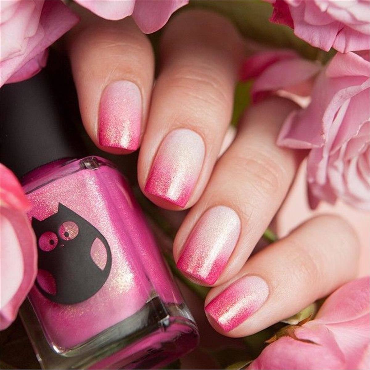 Ногти с переходом цвета (фото одного из вариантов представлено дальше) лучше начинать выполнять, работая с обычным лаком. Вероятность того, что с первого раза не получится нужный эффект, велика. Используя обычный лак, можно сколько угодно переделывать работу. С гелем такой возможности не будет, и маникюр будет испорчен.