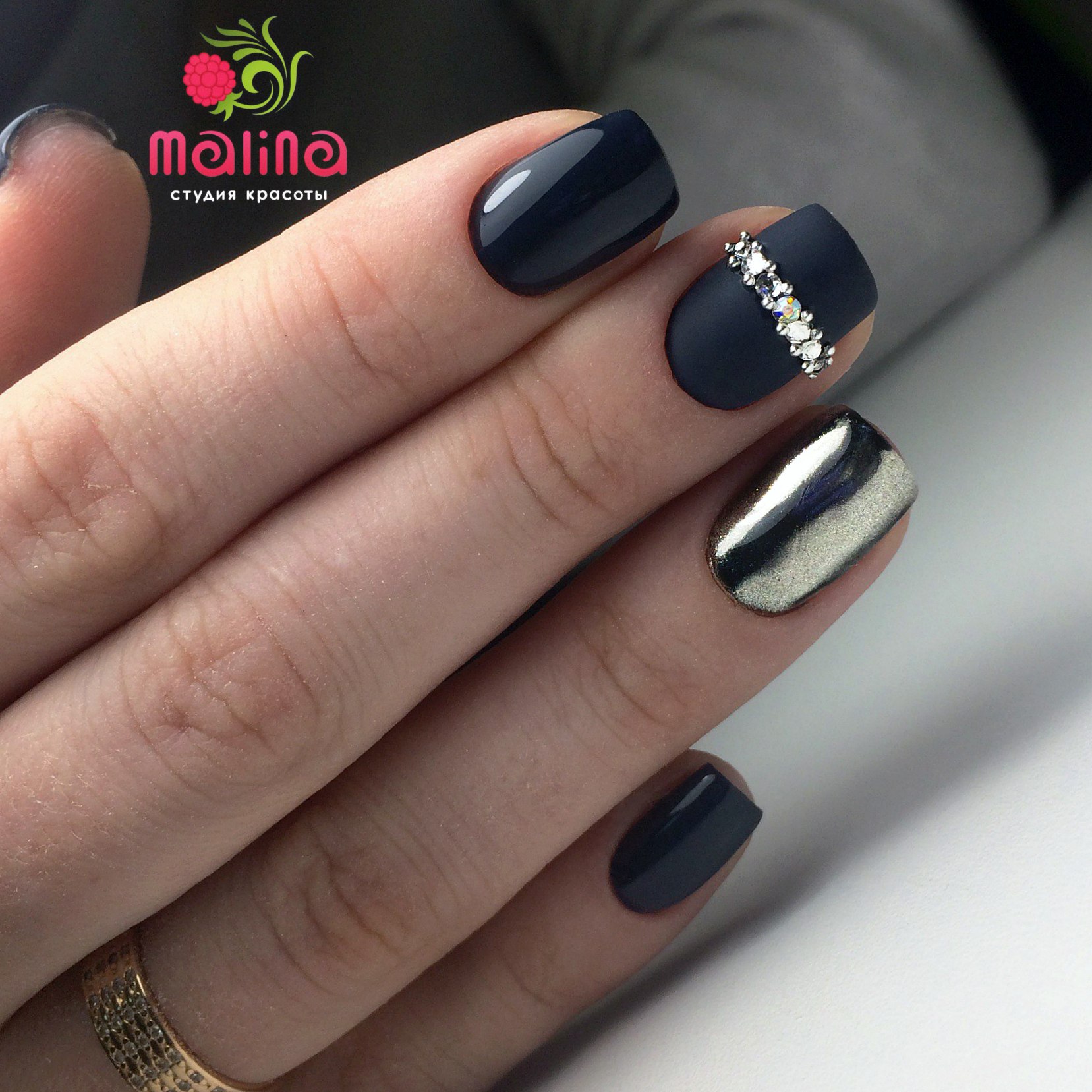Комбинирование лака оттенка антрацита и втирки любого цвета – этот приём способен придать любому маникюру роскошный вид. В этом сезоне рекомендуется использование втирки по всей поверхности ногтя.