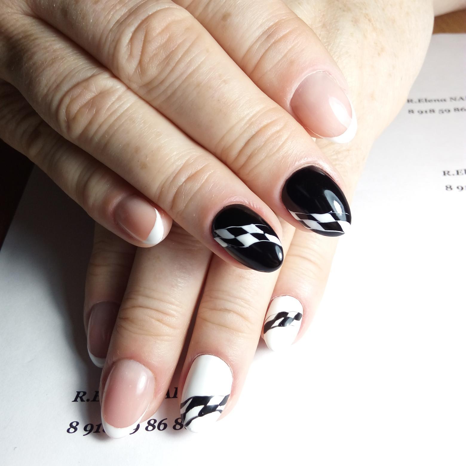 Следует понимать, что белый цвет, а в данном случае основа, расширяет ногтевую пластину и без того короткой длины. Поэтому если использовать черный горошек, то мелкий, если вензельные узоры и кружево, то из тонких линий. А в случае с омбре выполнять нужно переход от черного края к белой лунке.