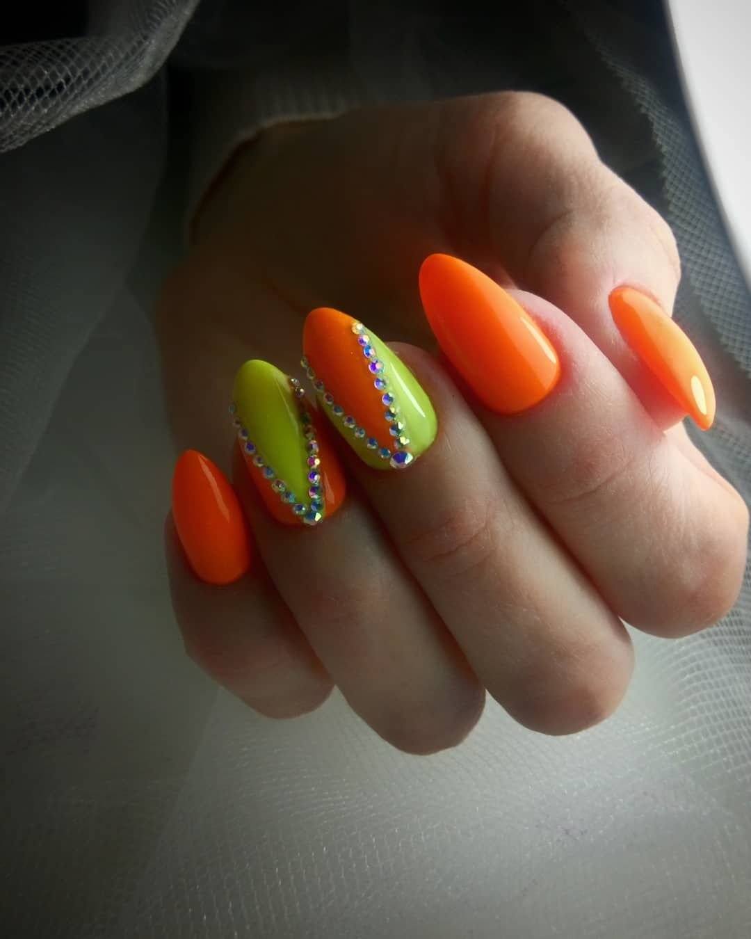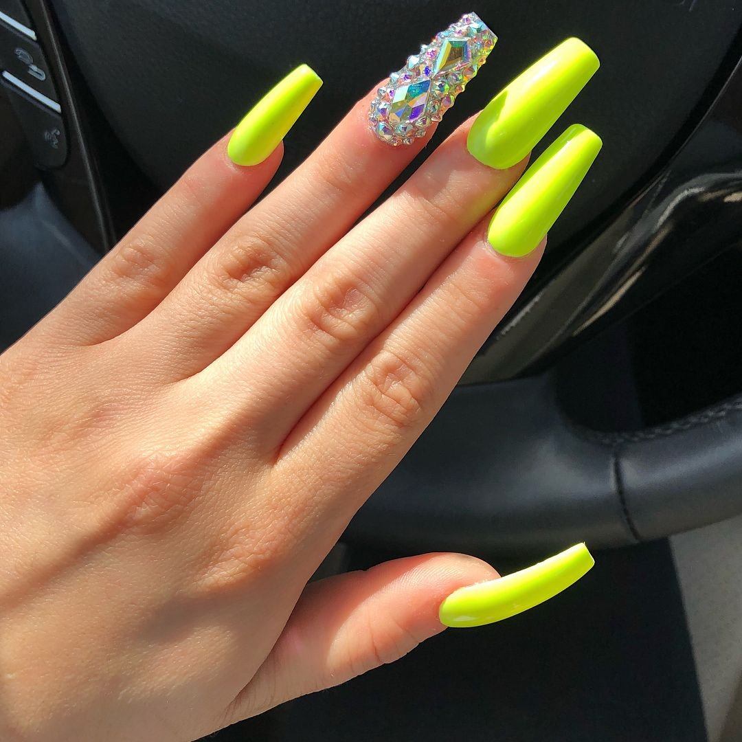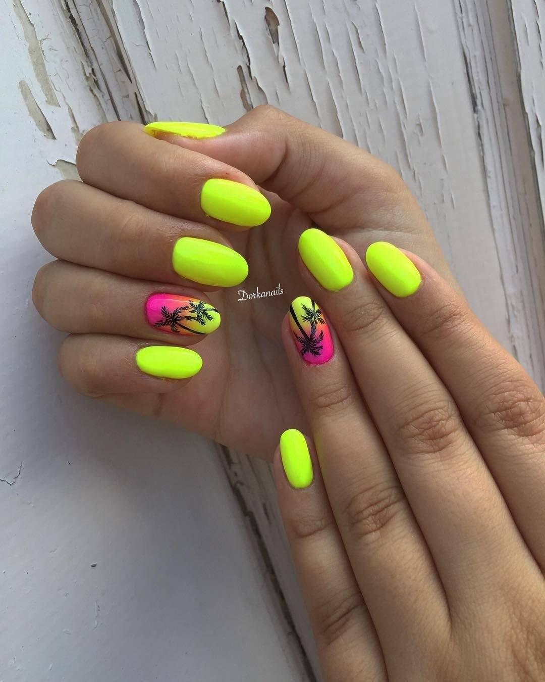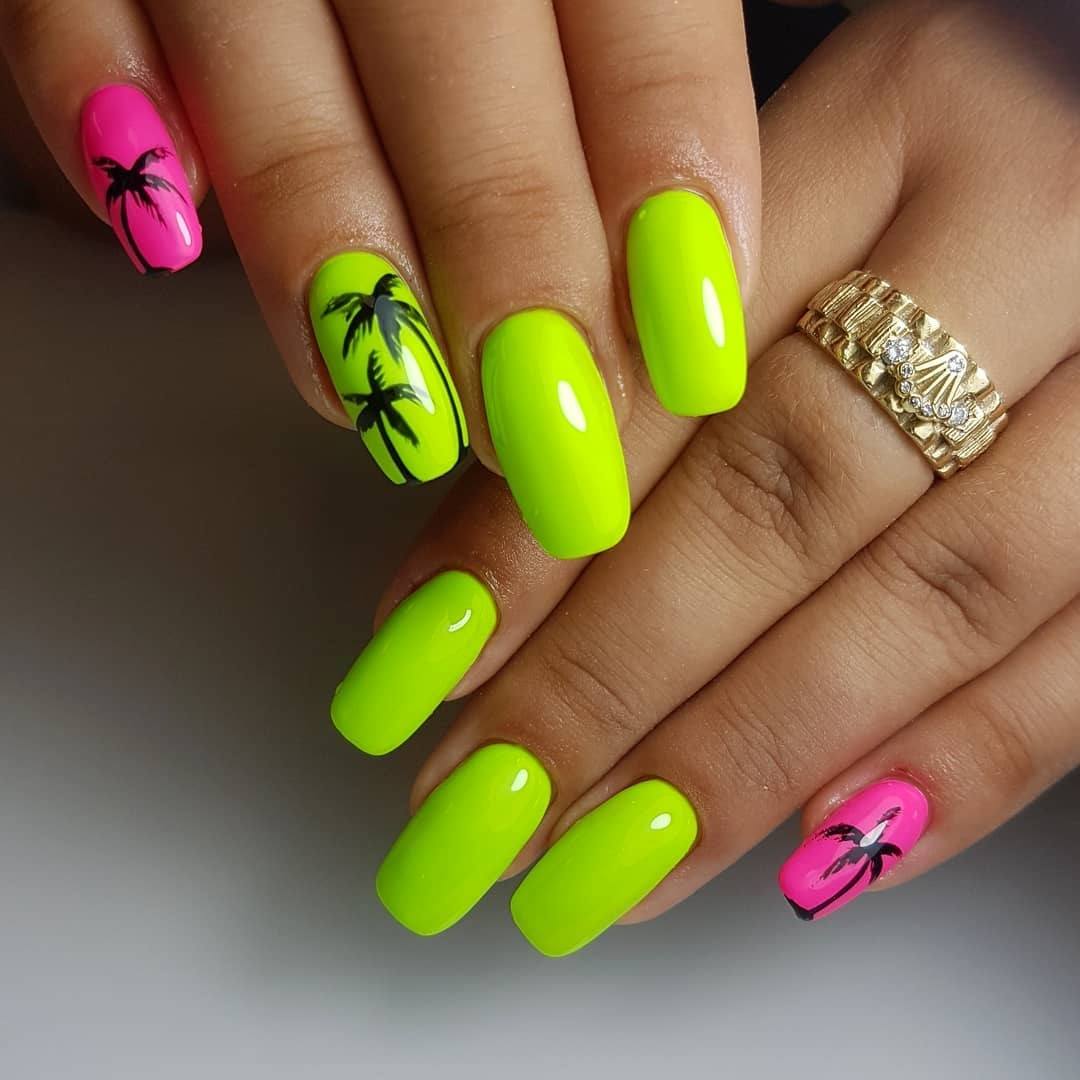 - неоновый маникюр лучше выглядит на коротких ногтях и ногтях средней длины. На длинных ногтях неоновые оттенки также могут смотреться красиво, но при условии незначительного их использования в общем дизайне.