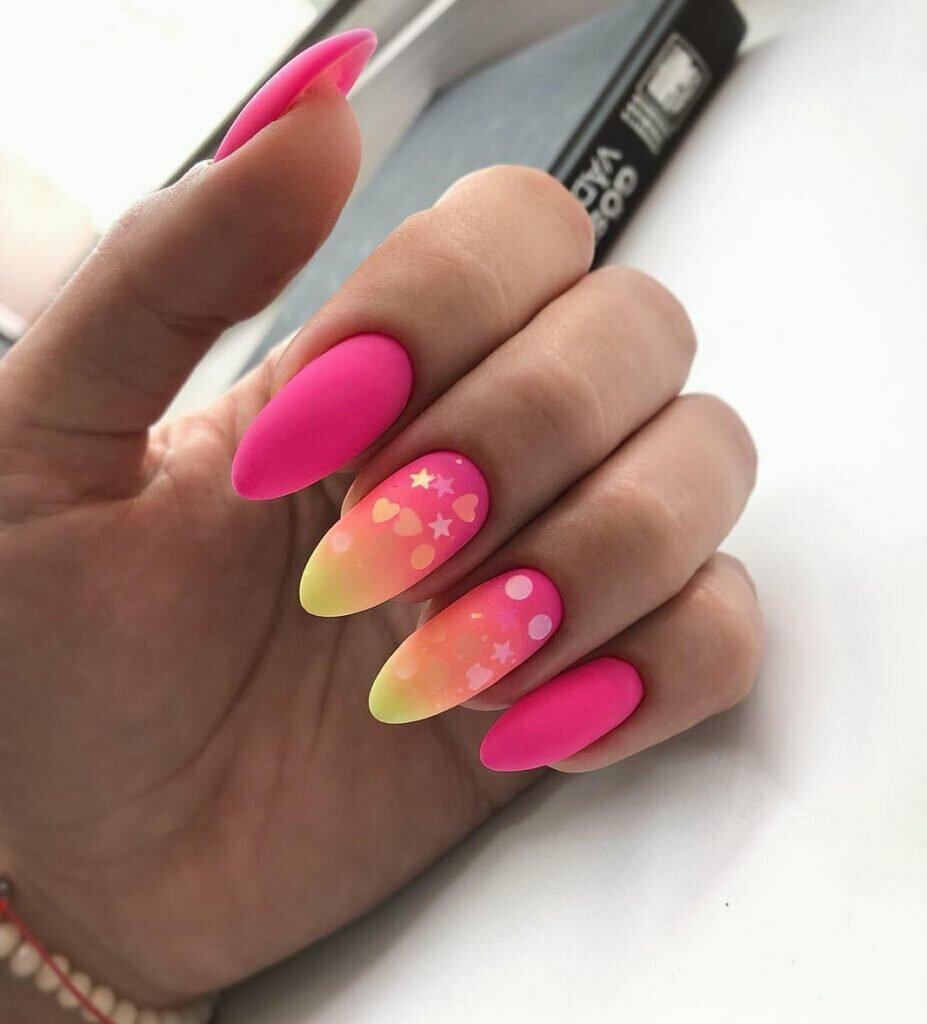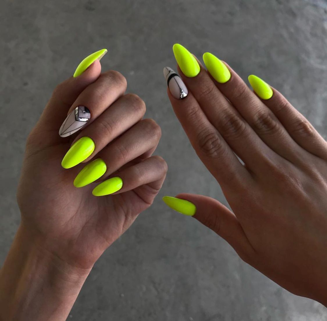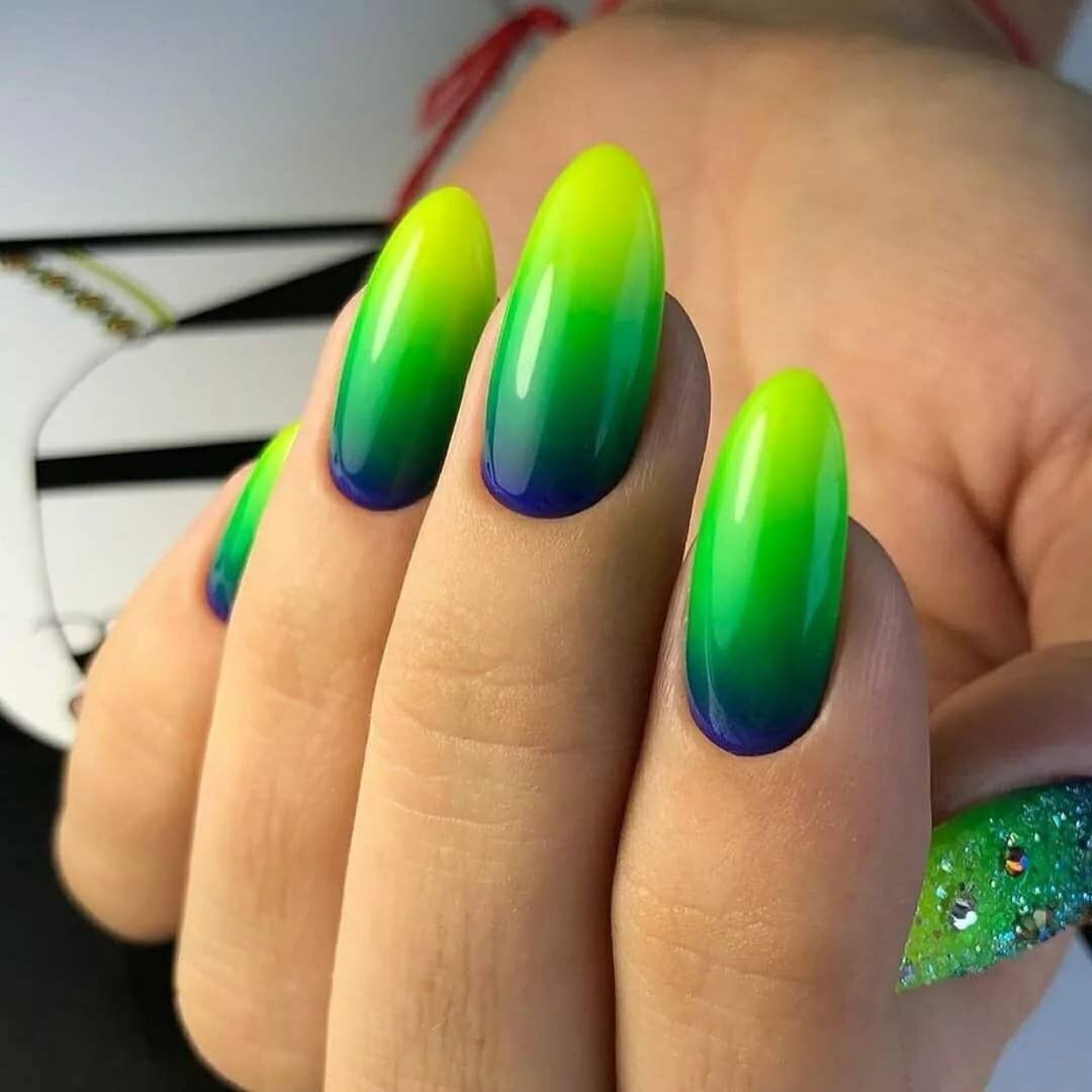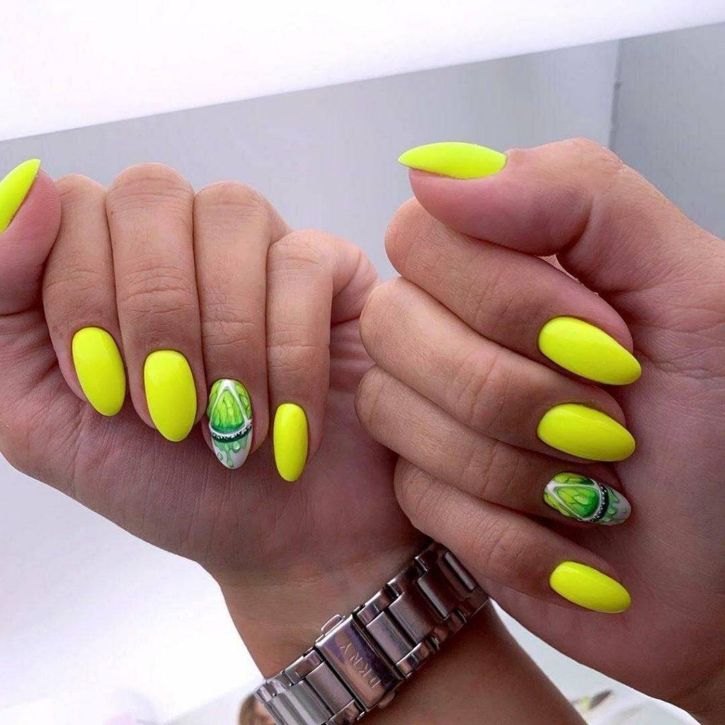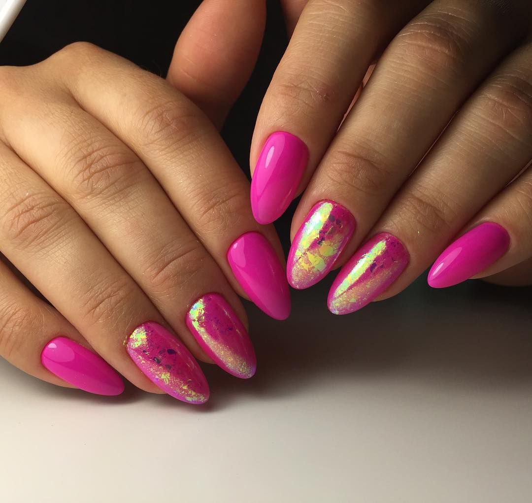Миндалевидная форма ногтевых пластин – одна из самых выигрышных. К ней подходят все варианты декора и оформления. Летом можно смело использовать неоновые и кислотные дуэты с мятой и лимонным, салатовым, фуксией. Прекрасное решение – радушная техника, градиент, омбре, дополнение втиркой и фольгой.
