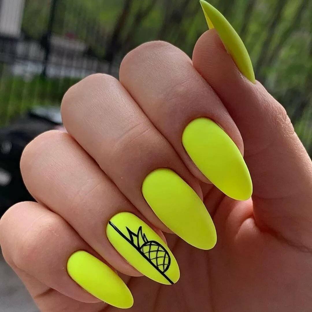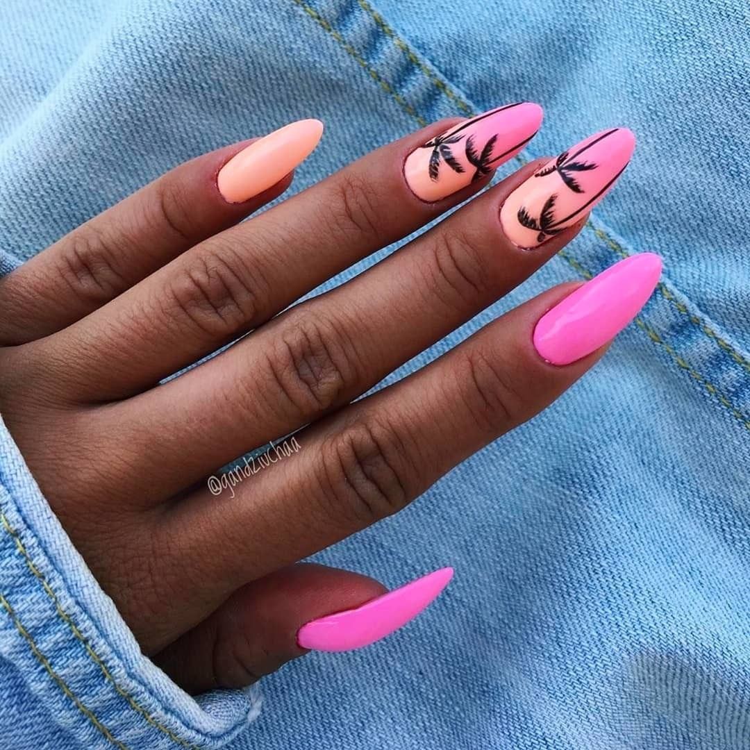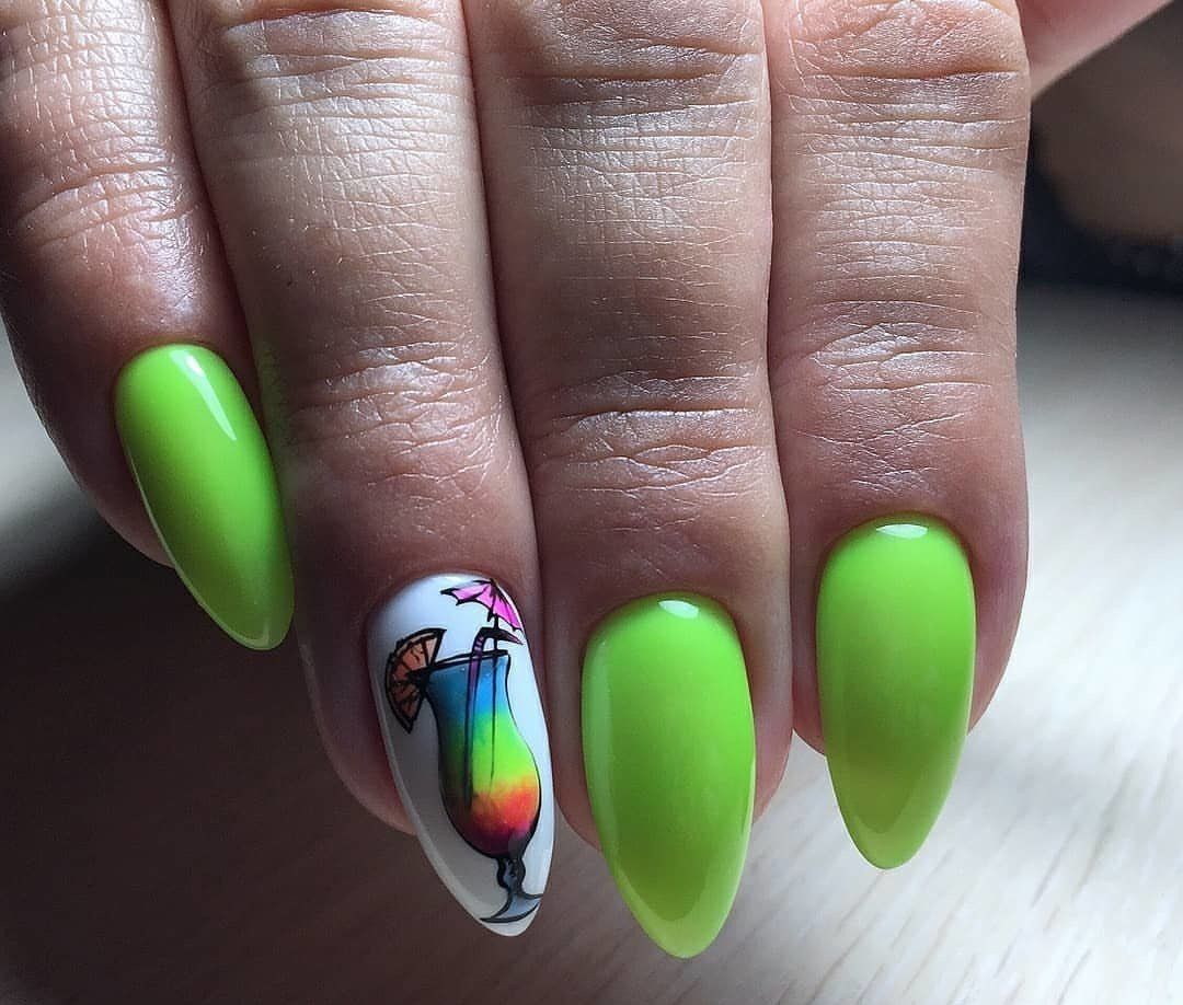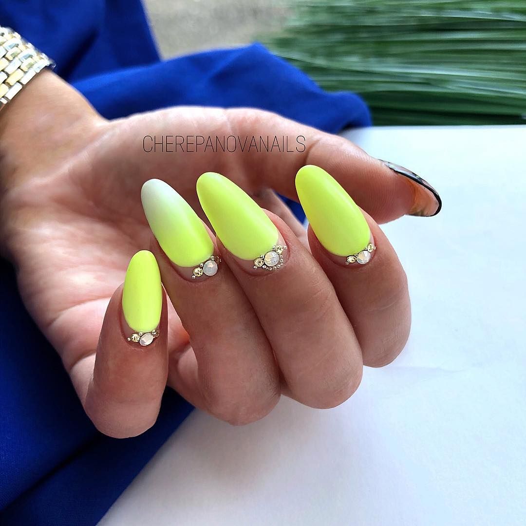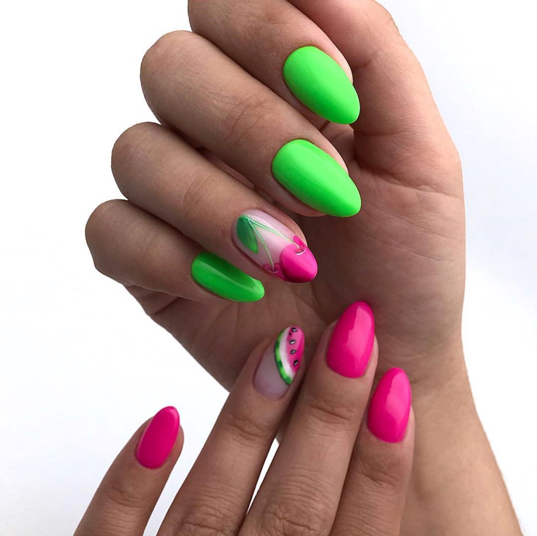 Миндалевидная форма ногтевых пластин – одна из самых выигрышных. К ней подходят все варианты декора и оформления. Летом можно смело использовать неоновые и кислотные дуэты с мятой и лимонным, салатовым, фуксией. Прекрасное решение – радушная техника, градиент, омбре, дополнение втиркой и фольгой.