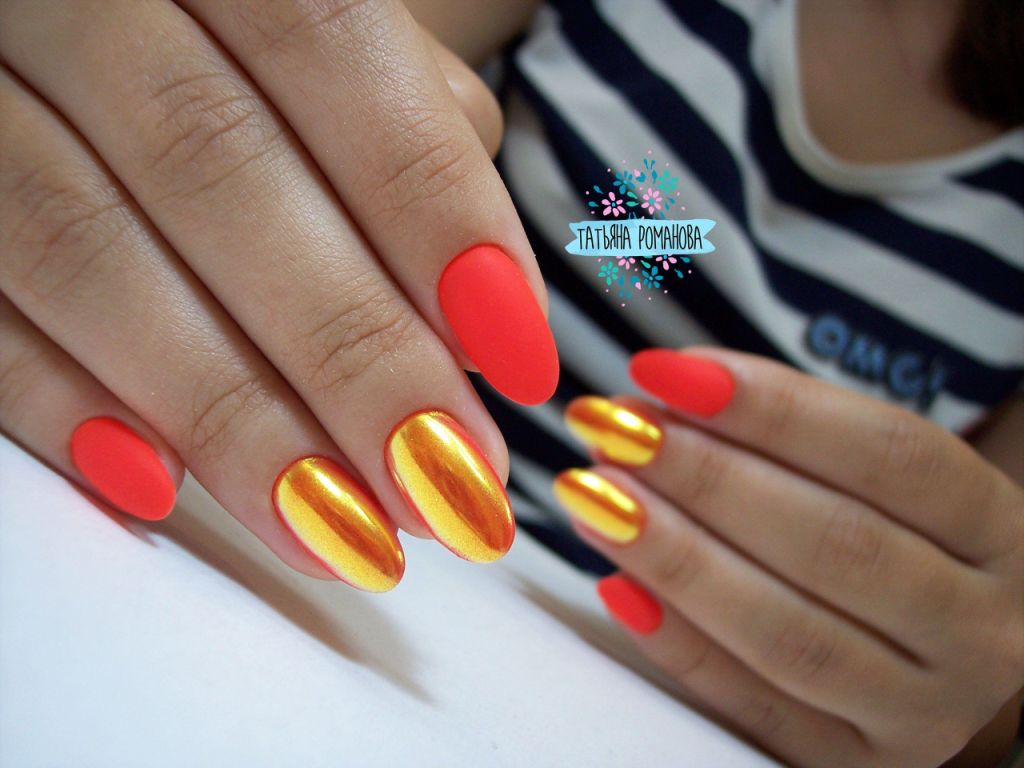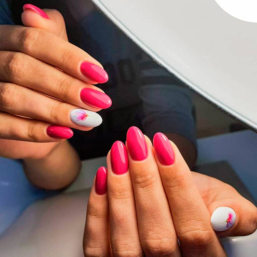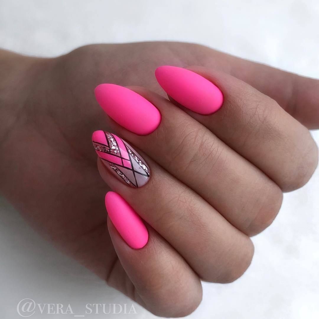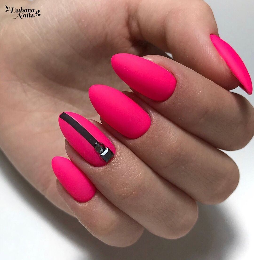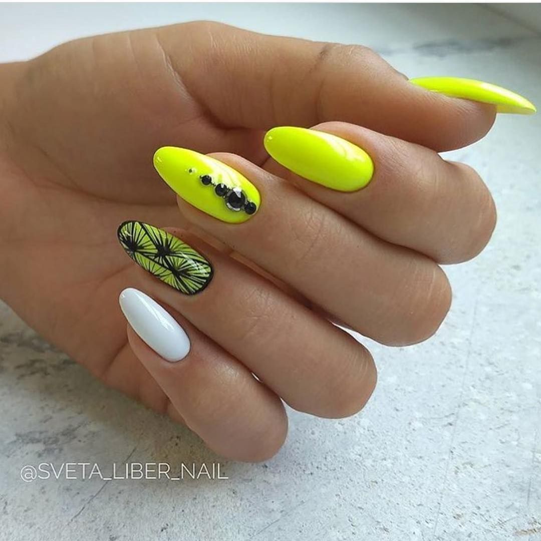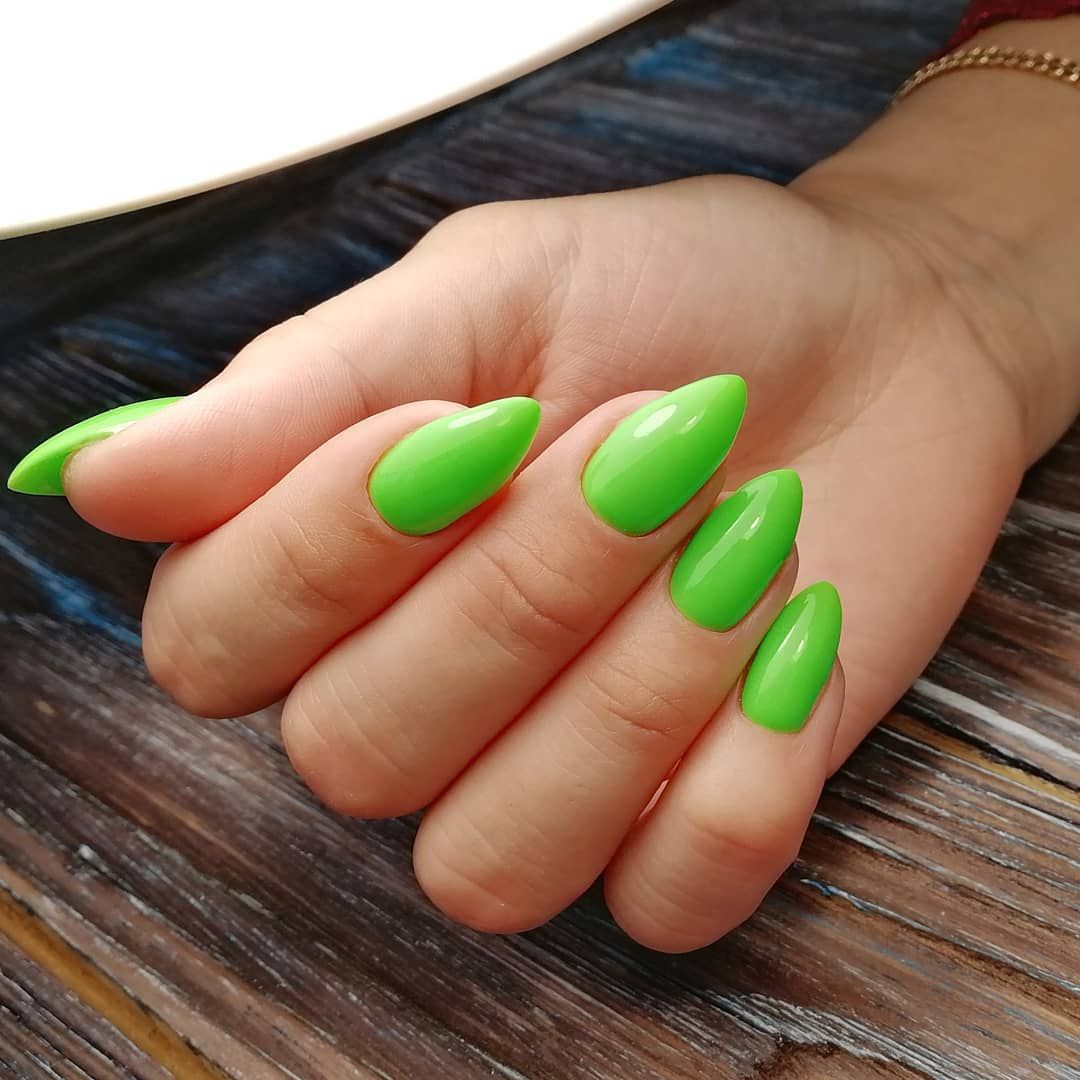 Миндалевидная форма ногтевых пластин – одна из самых выигрышных. К ней подходят все варианты декора и оформления. Летом можно смело использовать неоновые и кислотные дуэты с мятой и лимонным, салатовым, фуксией. Прекрасное решение – радушная техника, градиент, омбре, дополнение втиркой и фольгой.