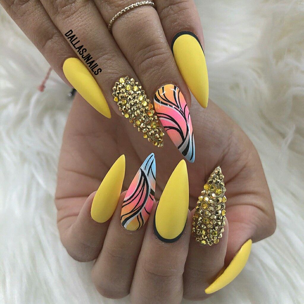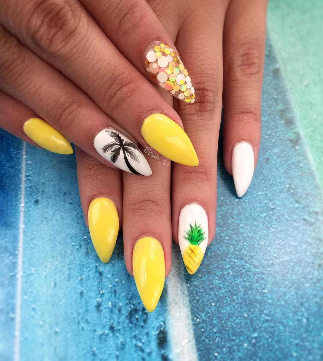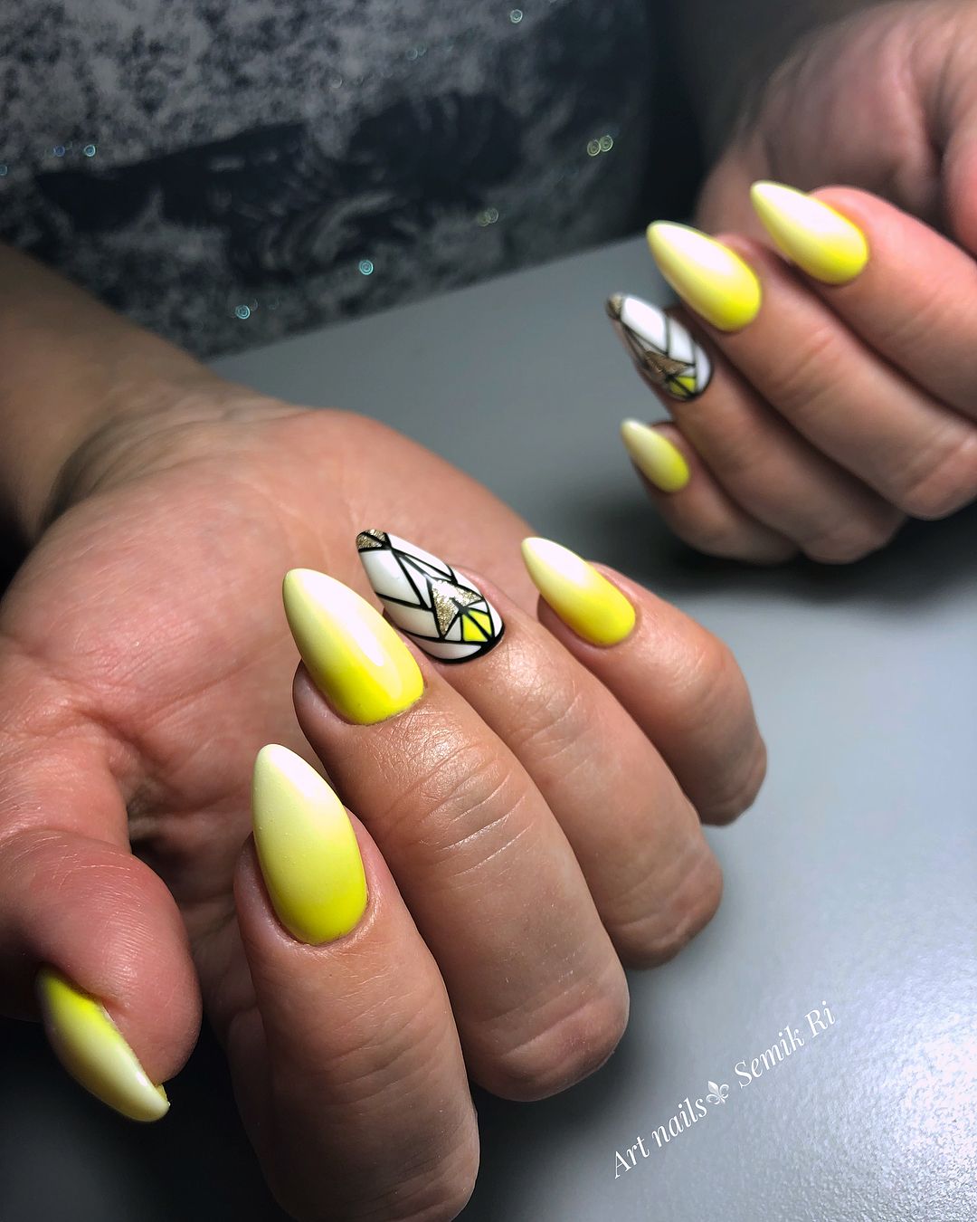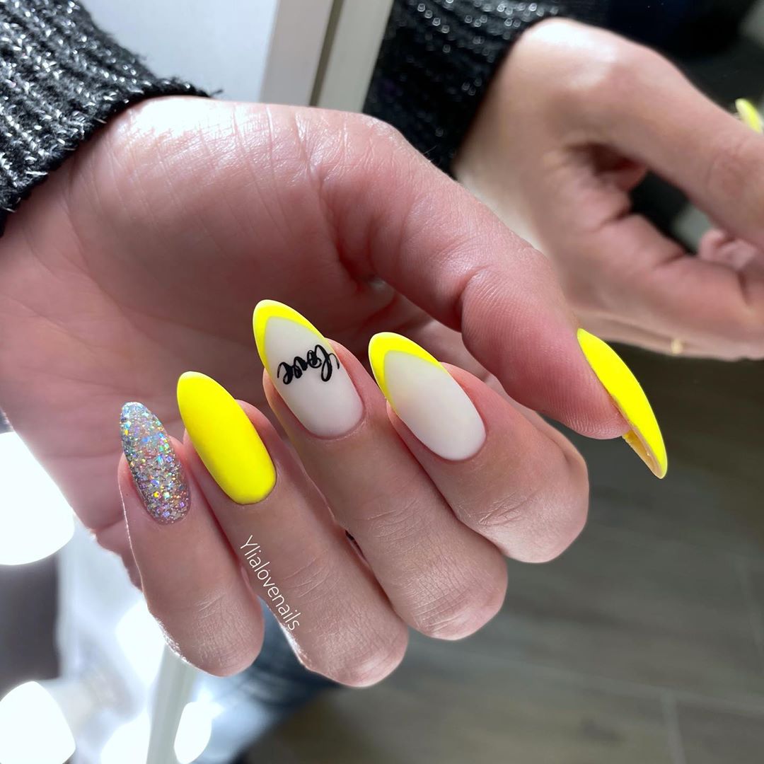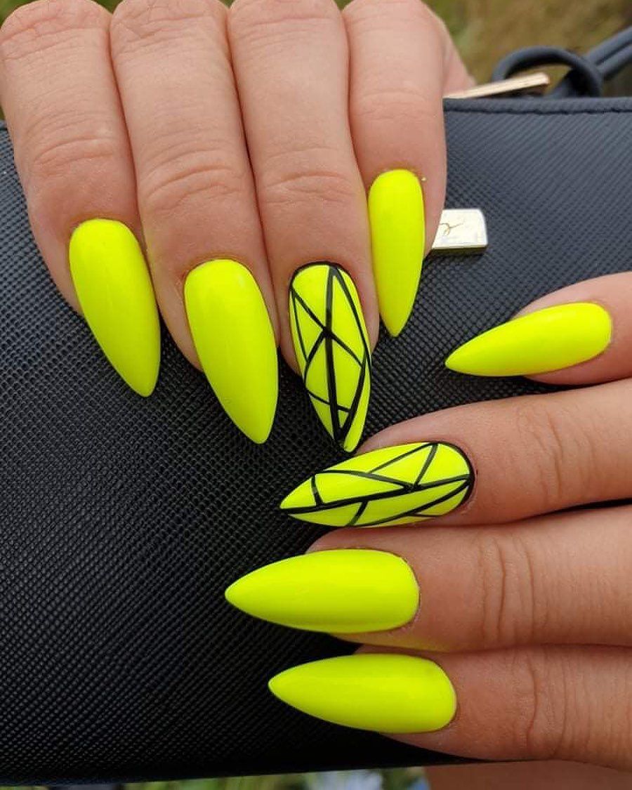 Миндалевидная форма ногтевых пластин – одна из самых выигрышных. К ней подходят все варианты декора и оформления. Летом можно смело использовать неоновые и кислотные дуэты с мятой и лимонным, салатовым, фуксией. Прекрасное решение – радушная техника, градиент, омбре, дополнение втиркой и фольгой.