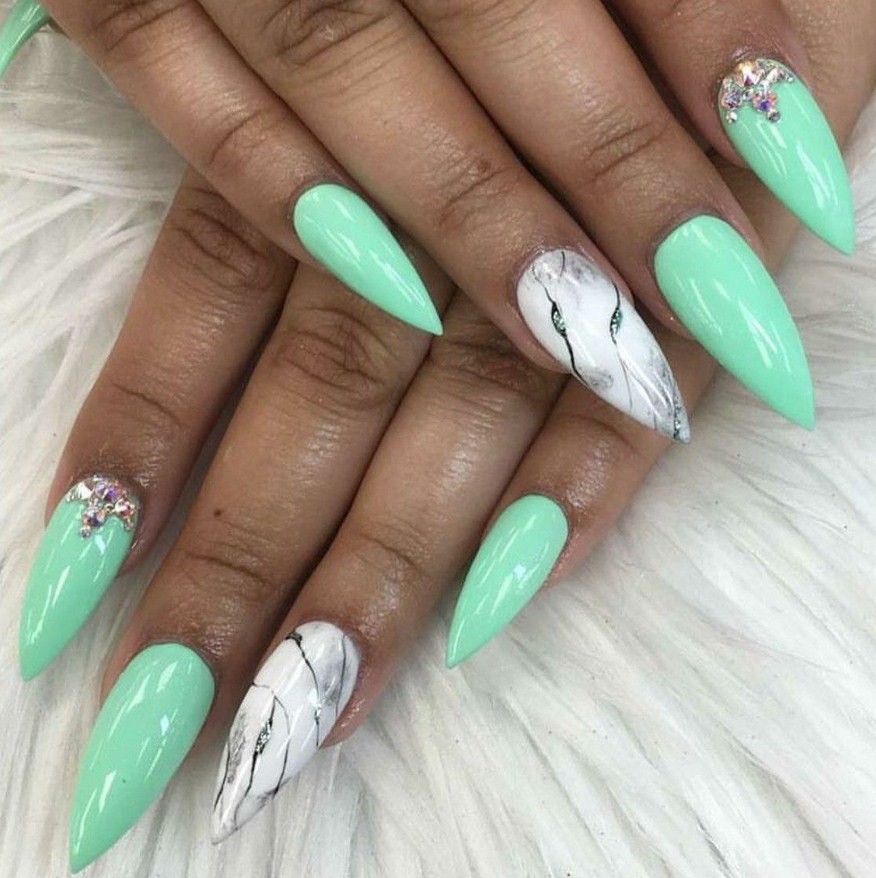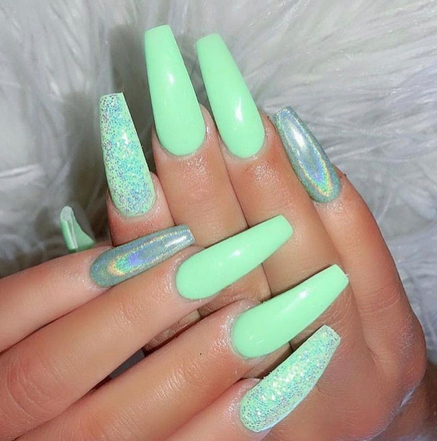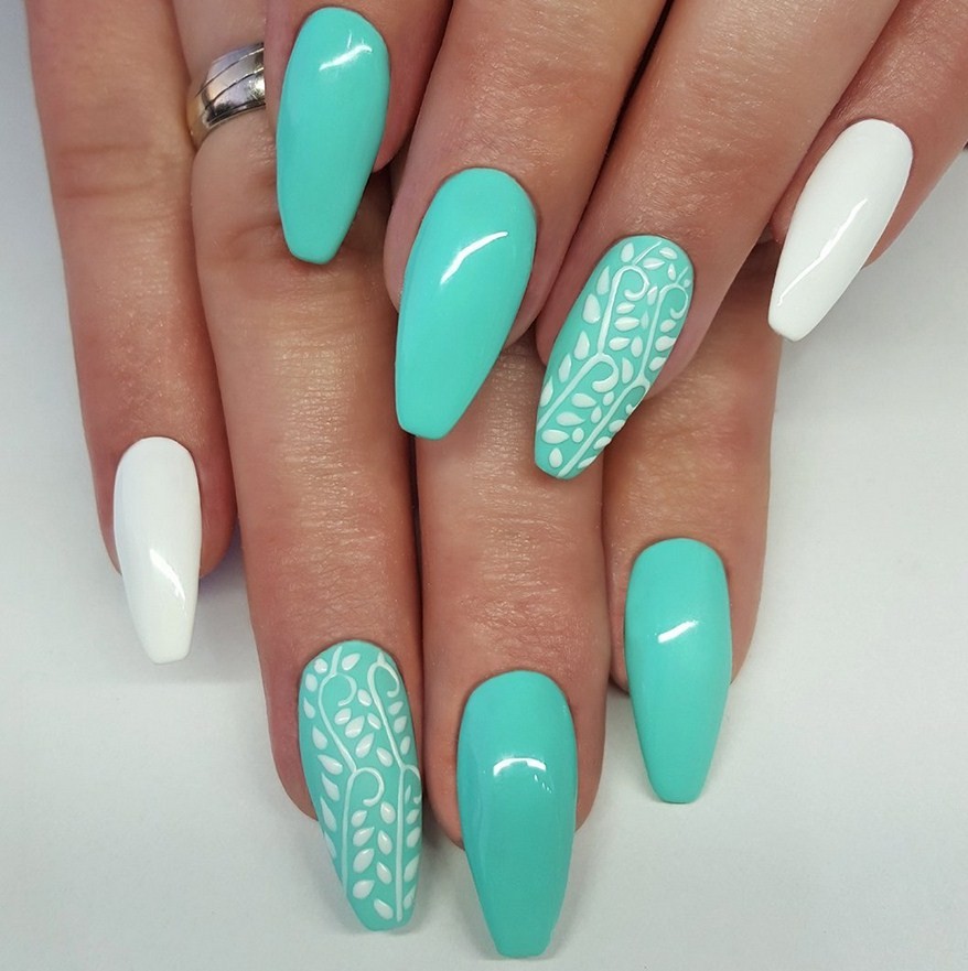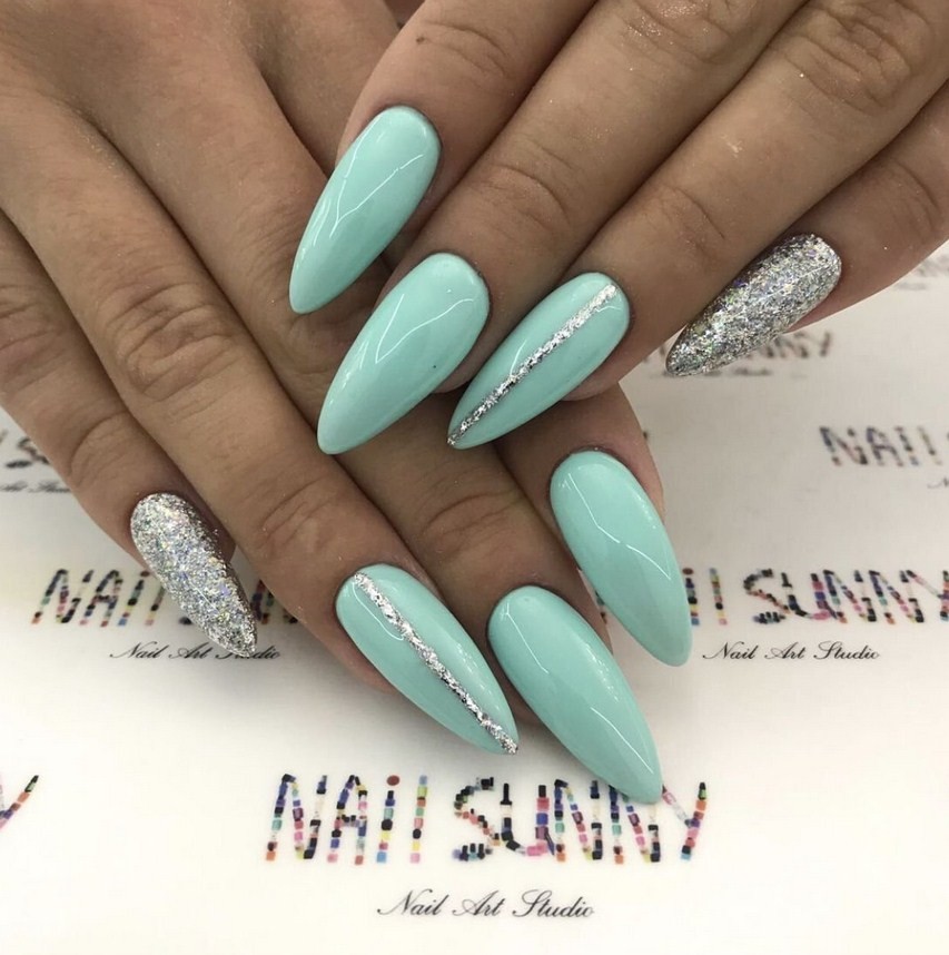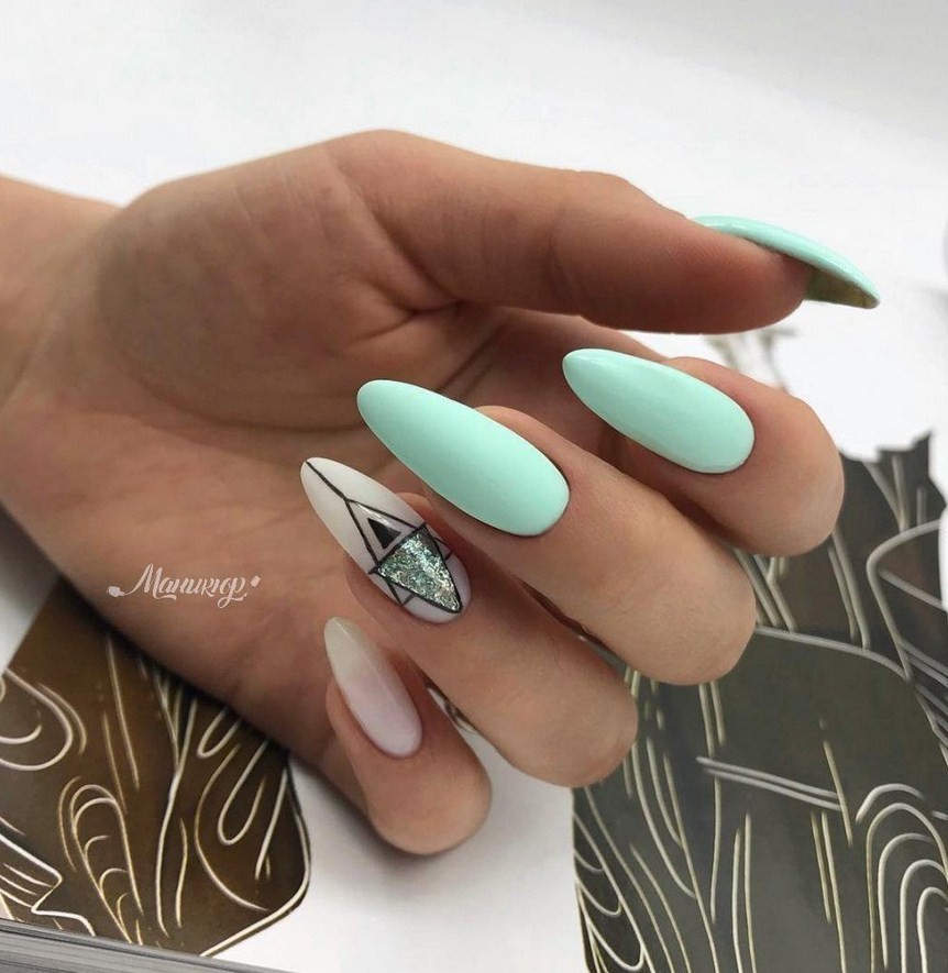 Длина ногтевой пластины для мятного нейл-арта может быть любой, но чем она больше, тем мягче должен быть опил уголков. На подобной форме шикарно выглядит френч, лунный дизайн, однотонное покрытие, геометрические и абстрактные рисунки, точки, техника перепелиное яйцо.