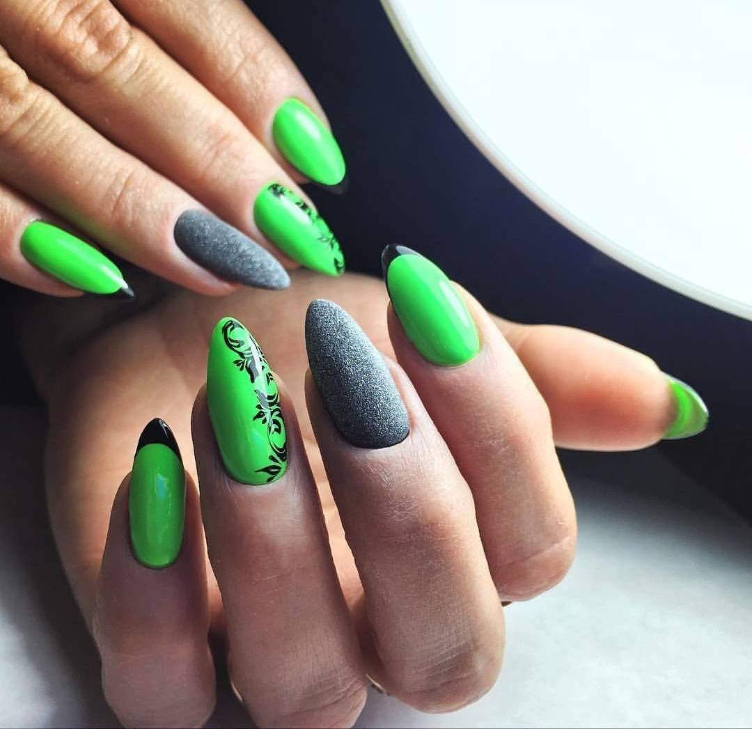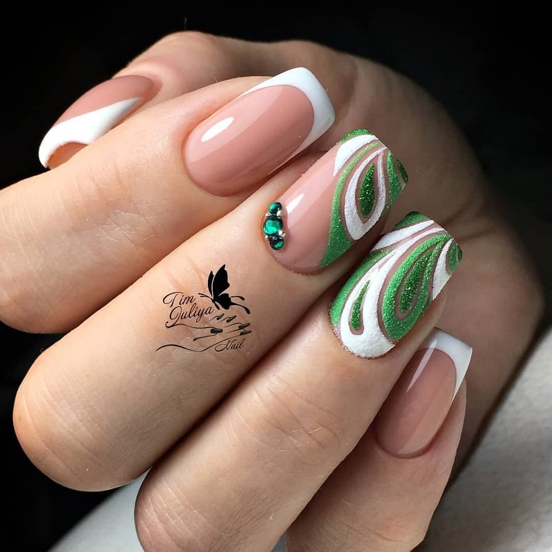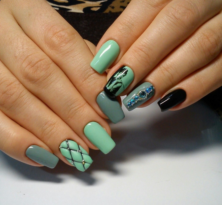 Зелёный цвет гармонично сочетается с серебром, кирпичным, синим, бордо, фиолетовым. Такие ногти хорошо дополнит золотая фольга.
