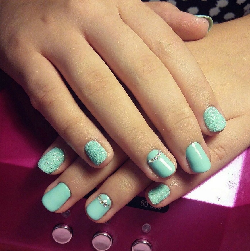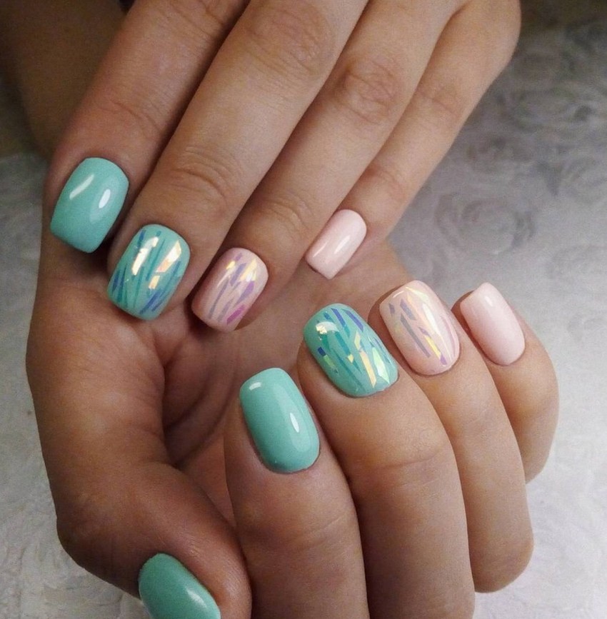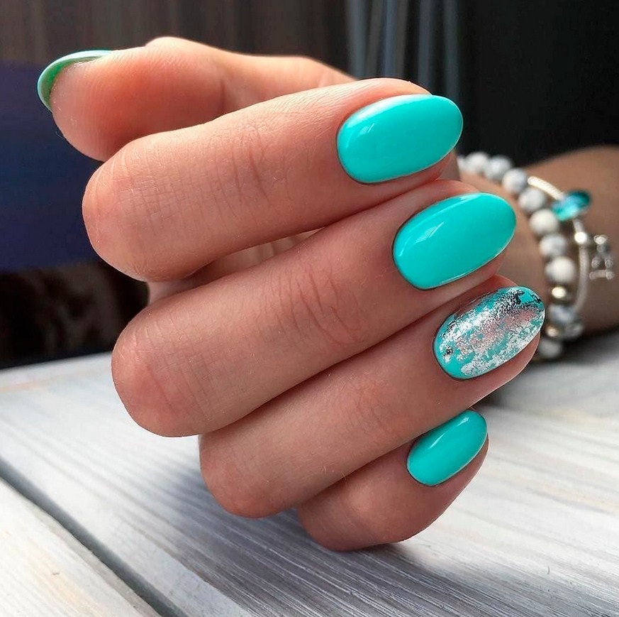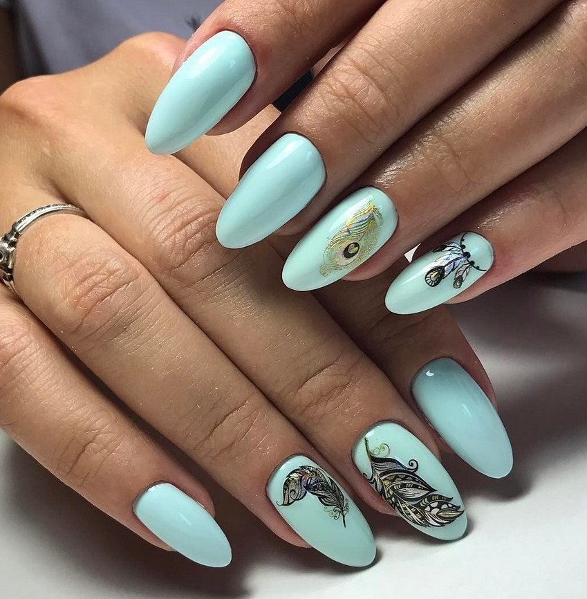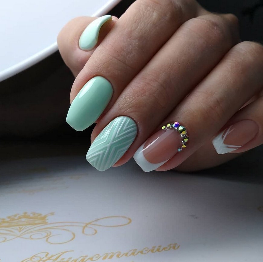 При небольшой длине ногтей все тона ментола и нежной бирюзы точно придутся кстати. Злоупотреблять дизайном не рекомендуется – даже монохромное покрытие будет выглядеть самодостаточным. Полностью декорировать ногтевые пластины не надо, разве что, использовать минималистичные рисуночки, геометрические принты, единичные слайдеры и наклейки.