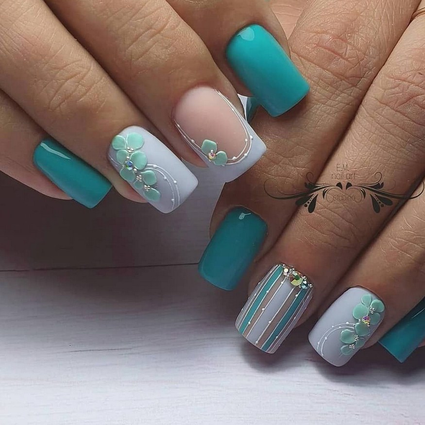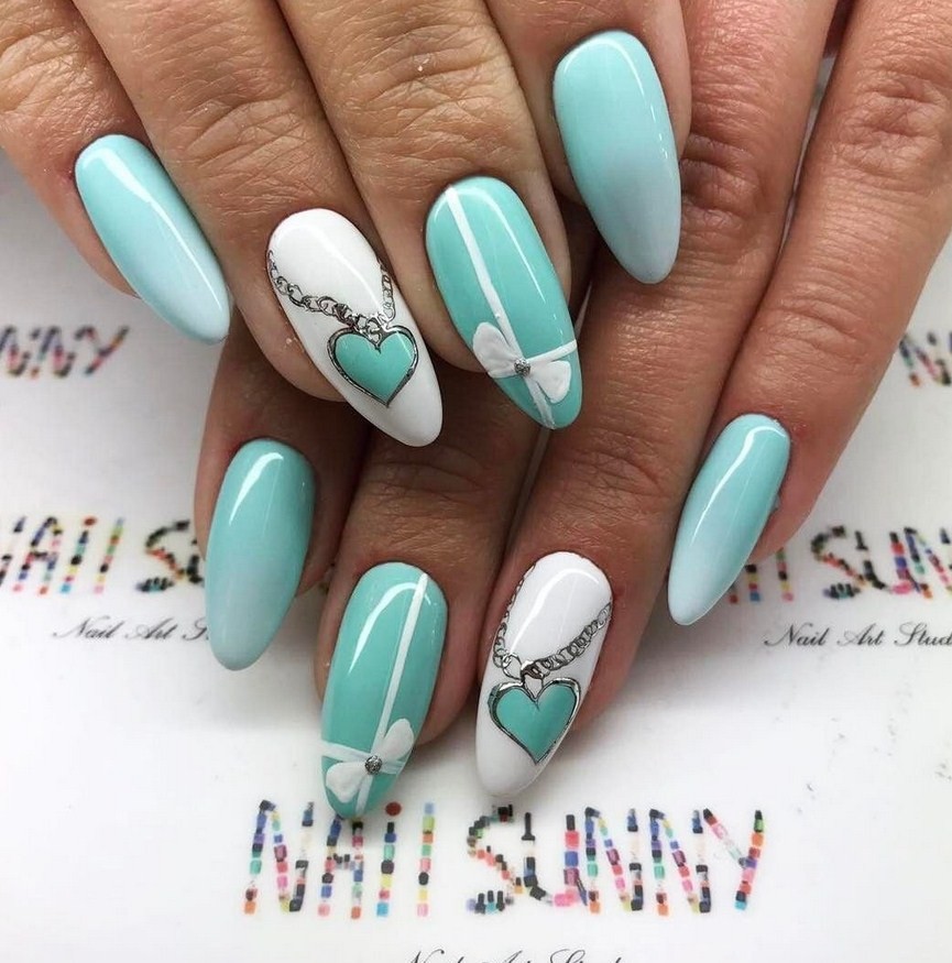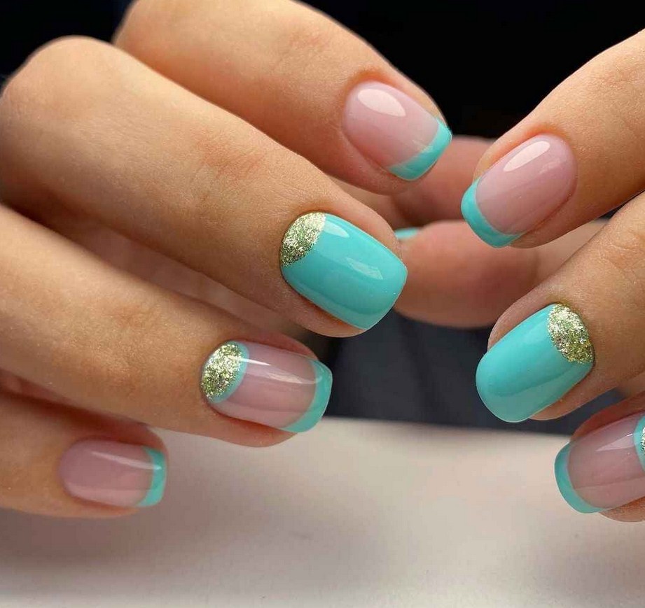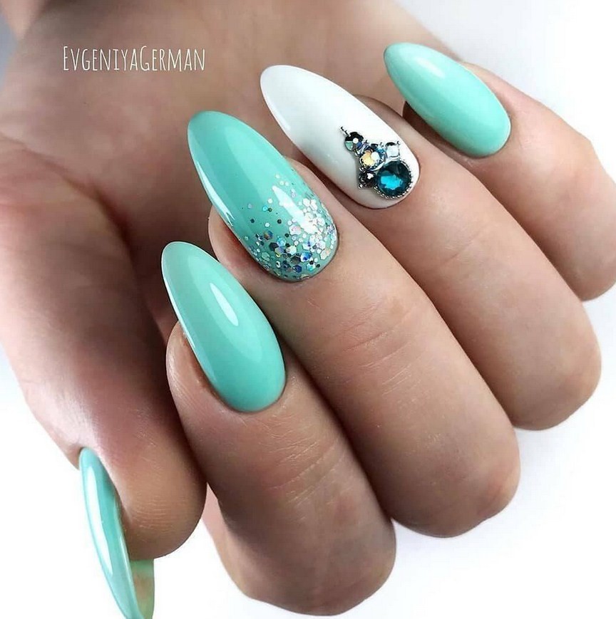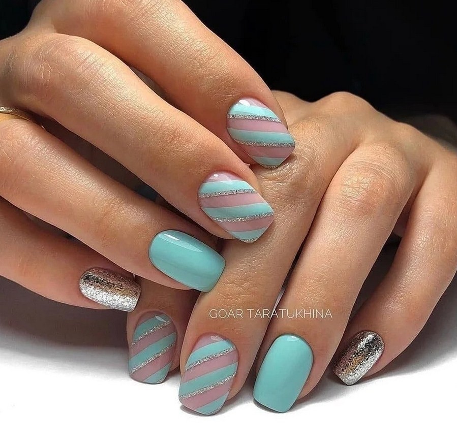 При небольшой длине ногтей все тона ментола и нежной бирюзы точно придутся кстати. Злоупотреблять дизайном не рекомендуется – даже монохромное покрытие будет выглядеть самодостаточным. Полностью декорировать ногтевые пластины не надо, разве что, использовать минималистичные рисуночки, геометрические принты, единичные слайдеры и наклейки.