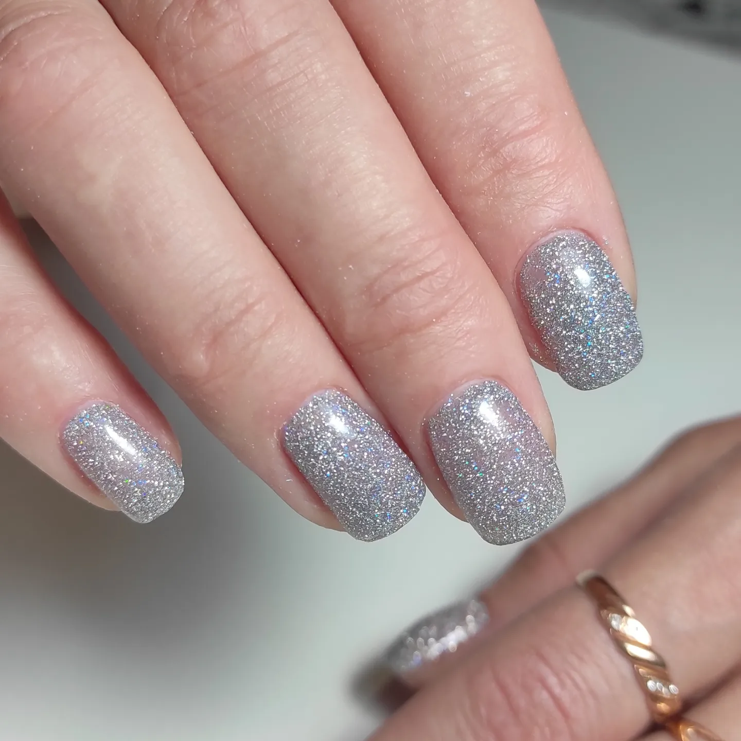 Молочные ногти, украшенные серебряным глиттером и белой полоской в виде френча, напоминают о зимней метели. Этот маникюр идеален для тех, кто желает добавить в свой зимний образ чувство магии и сказочности, отражая красоту заснеженной зимы.