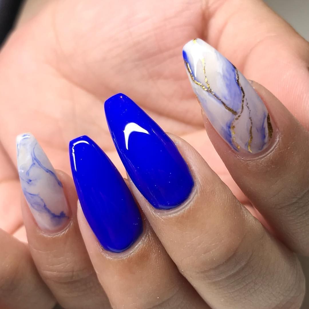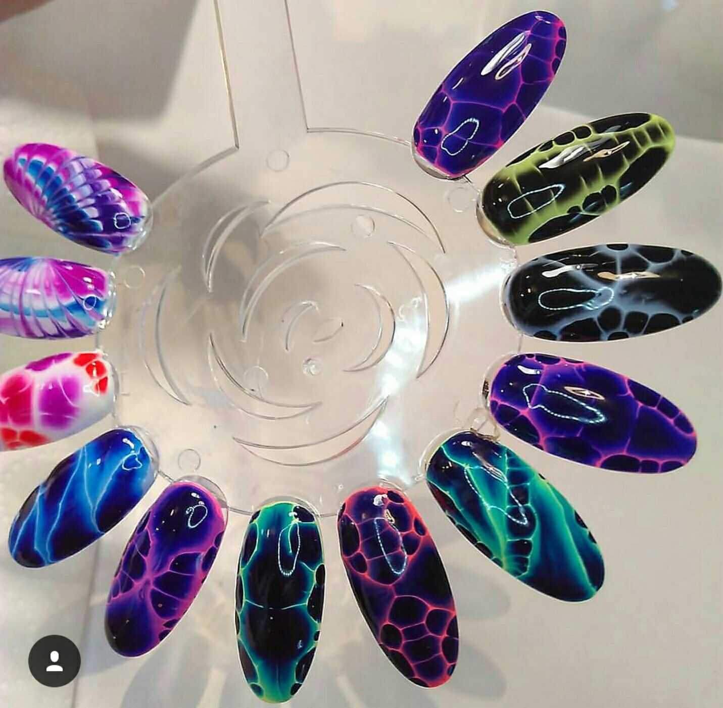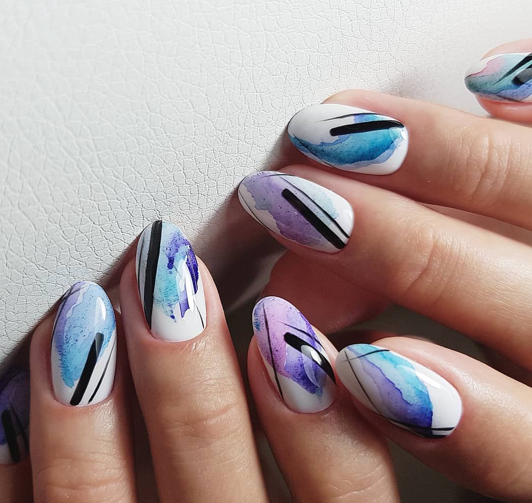 Разводы отлично смотрятся в дизайне с геометрией. Для этого выполняйте окантовку узора с разводами прямыми тонкими линиями, треугольниками. Выполняйте узор с разводами внутри ромбов и треугольников. В качестве цвета для окантовки можно использовать черный или белый гель-лак.