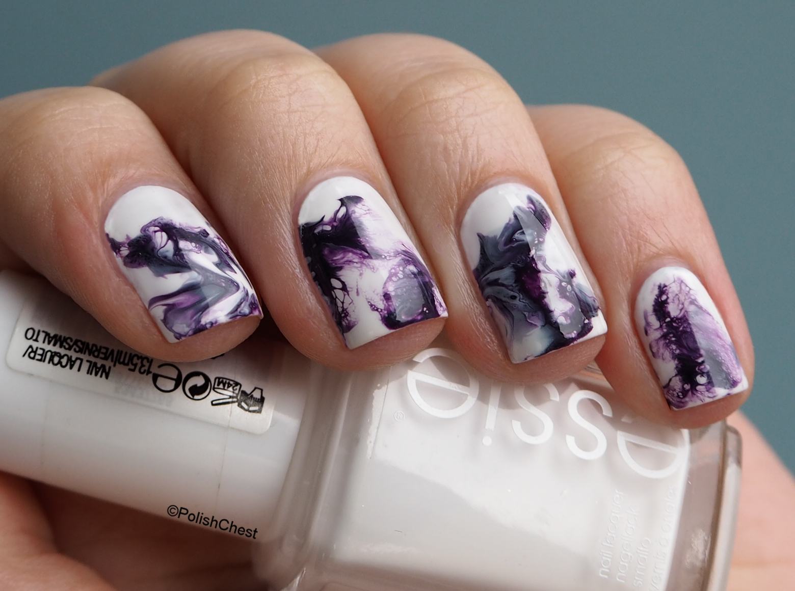 В завершение кисть окунают в спиртовую жидкость и начинают ею проводить вдоль линий — в результате белый лак «поплывет». Далее следует дождаться, пока декоративный слой полностью высохнет, и в конце его зафиксировать финишным покрытием.