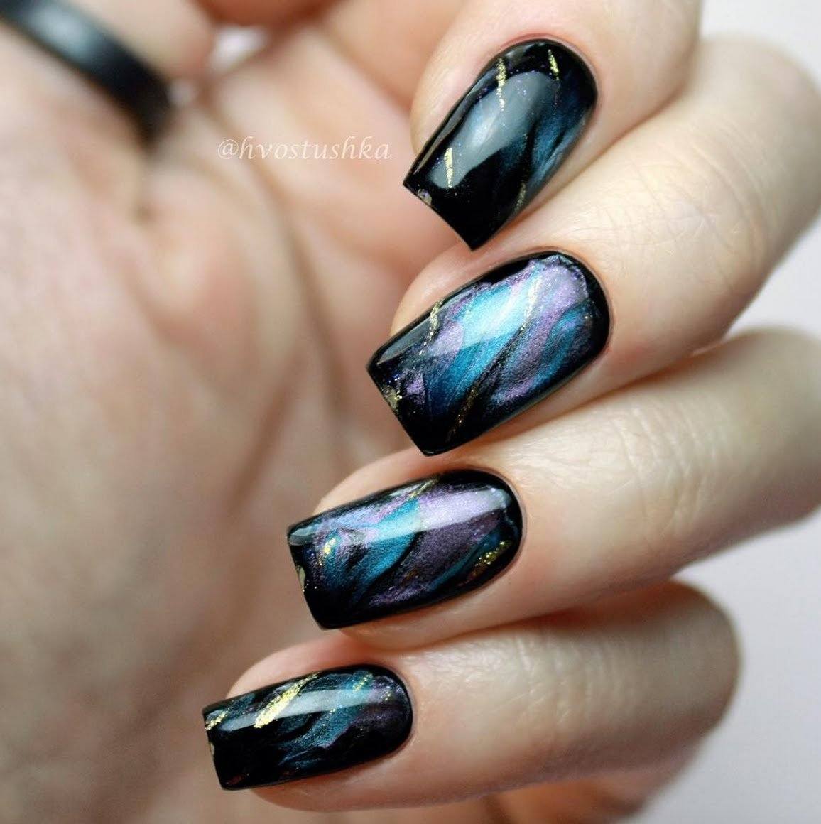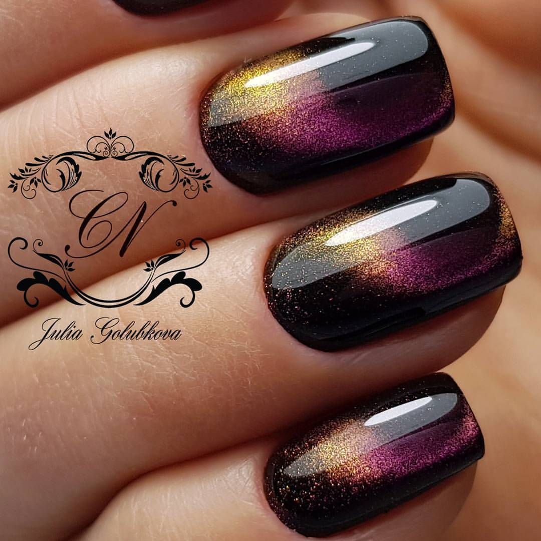 Для этого исполнения важно использовать одновременно несколько цветов, делая плавные их переходы. В итоге ноготки приобретут особую загадочность и лоск