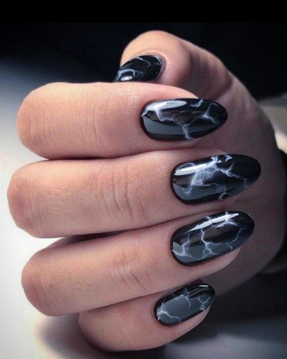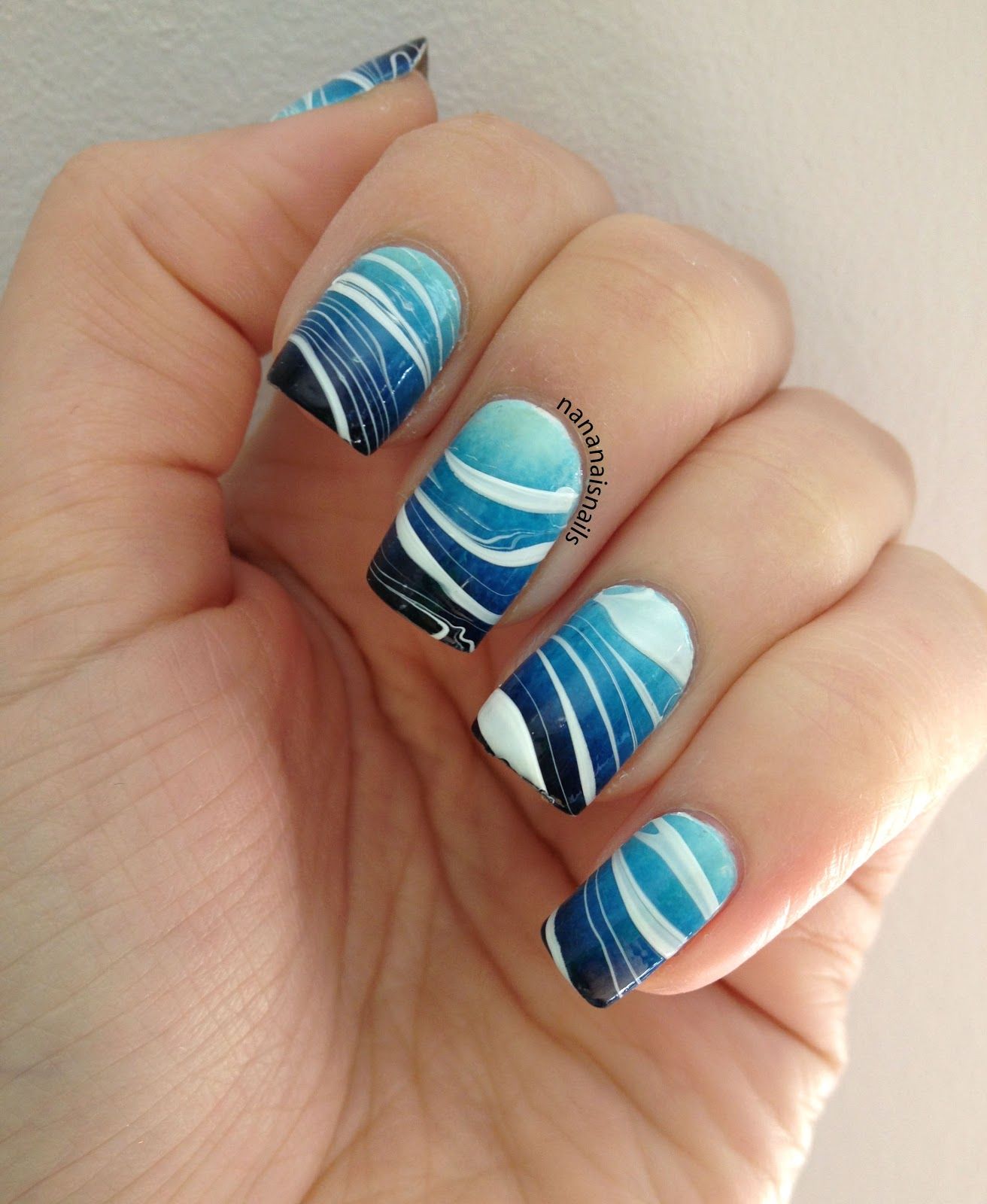 Ногти вначале покрывают базой, а потом двумя слоями черного лака. При помощи белого гель-лака создают небольшие волнообразные полоски, потом кисть смачивают в жидкости и продолжают формировать очертания линий.