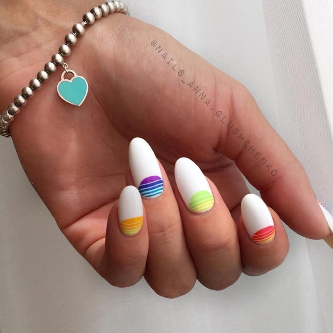 Всегда актуальны белые ногти, которые сами по себе нейтральны. Но если их сочетать с яркими оттенками — чёрным, красным, синим, марсала, зелёным или оранжевым, то получится эффектный маникюр, который бросается в глаза.