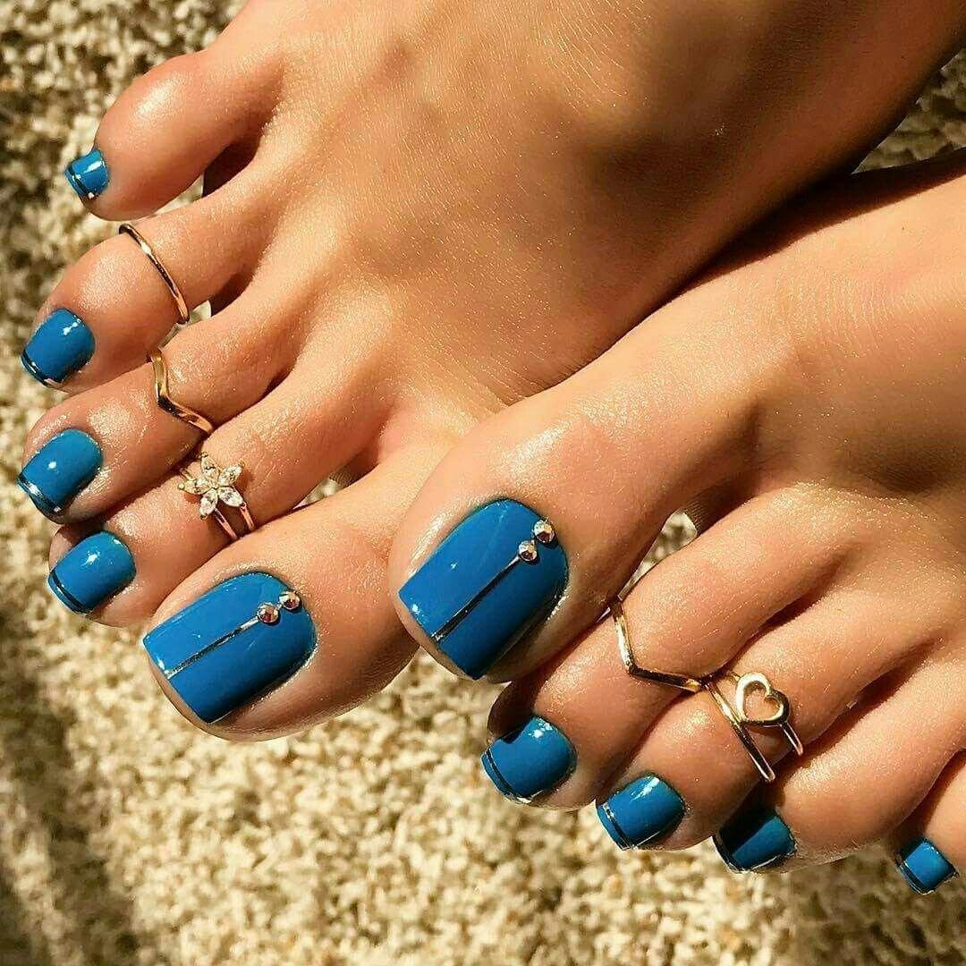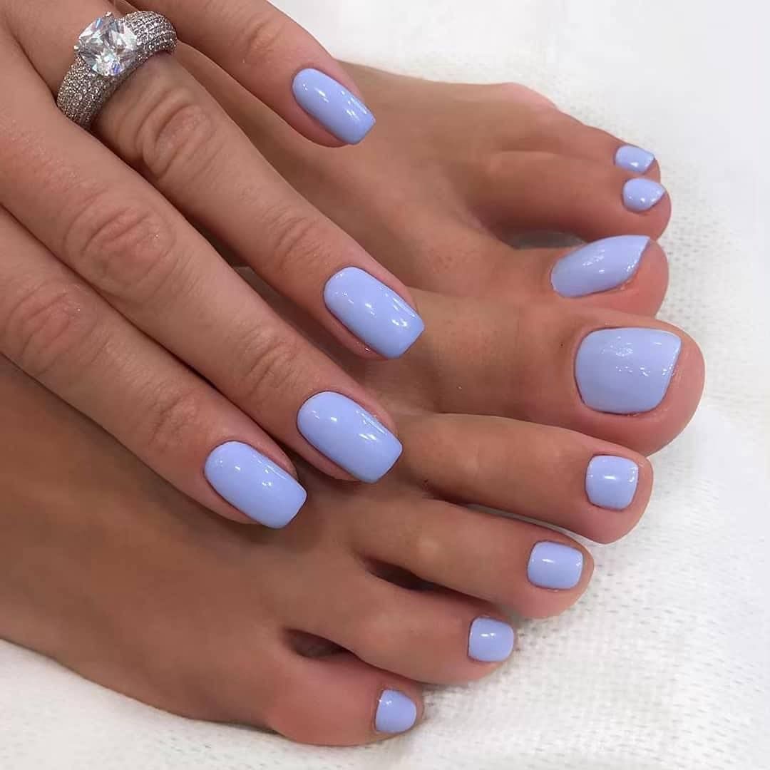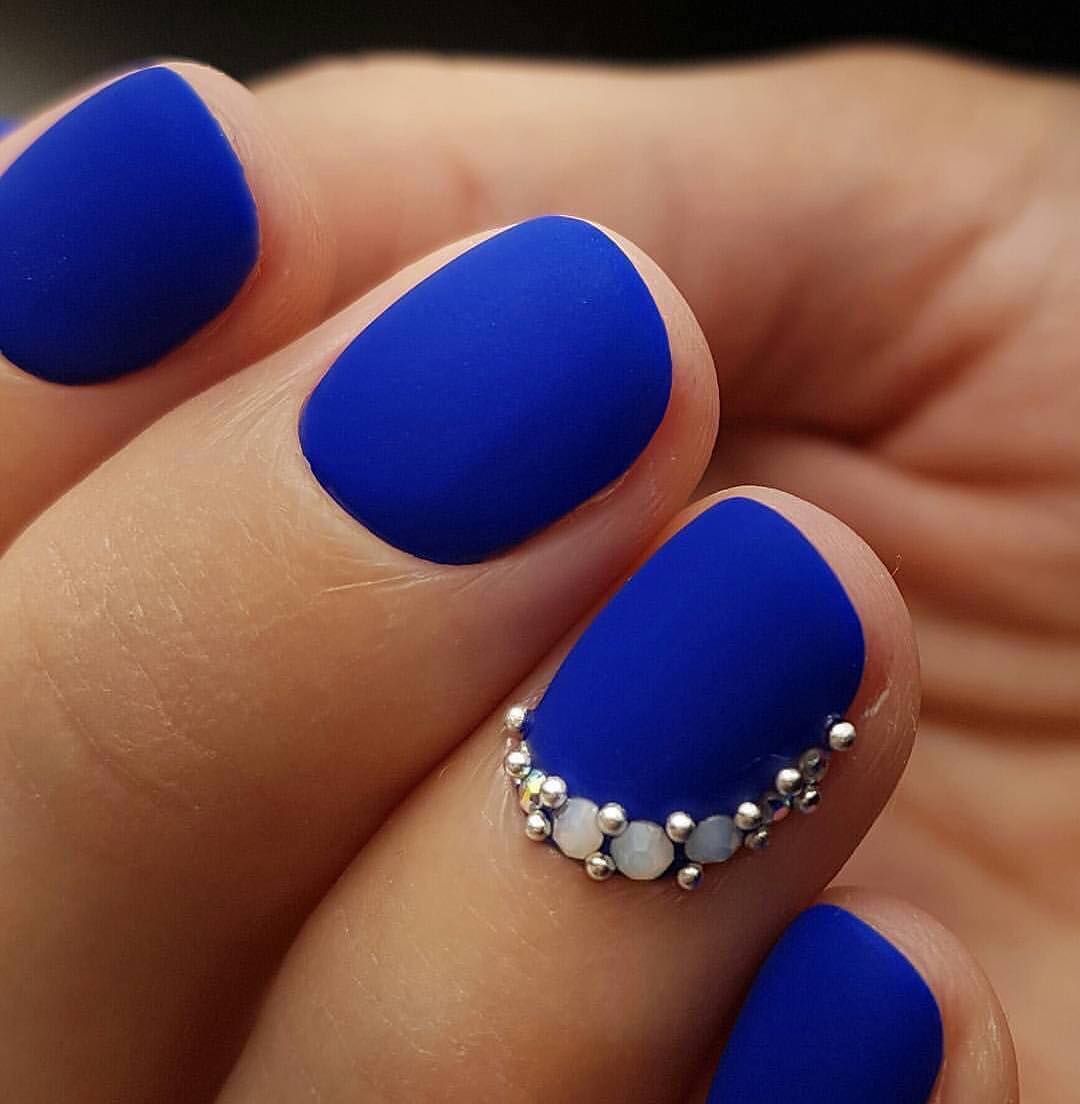 Чистое летнее небо — что может быть лучше в качестве идеи для яркого простого летнего маникюра. Не забывайте о том, что палитра этого оттенка очень богата. Если хотите сделать простой декор, выбирайте омбре — от белого до глубокого синего.