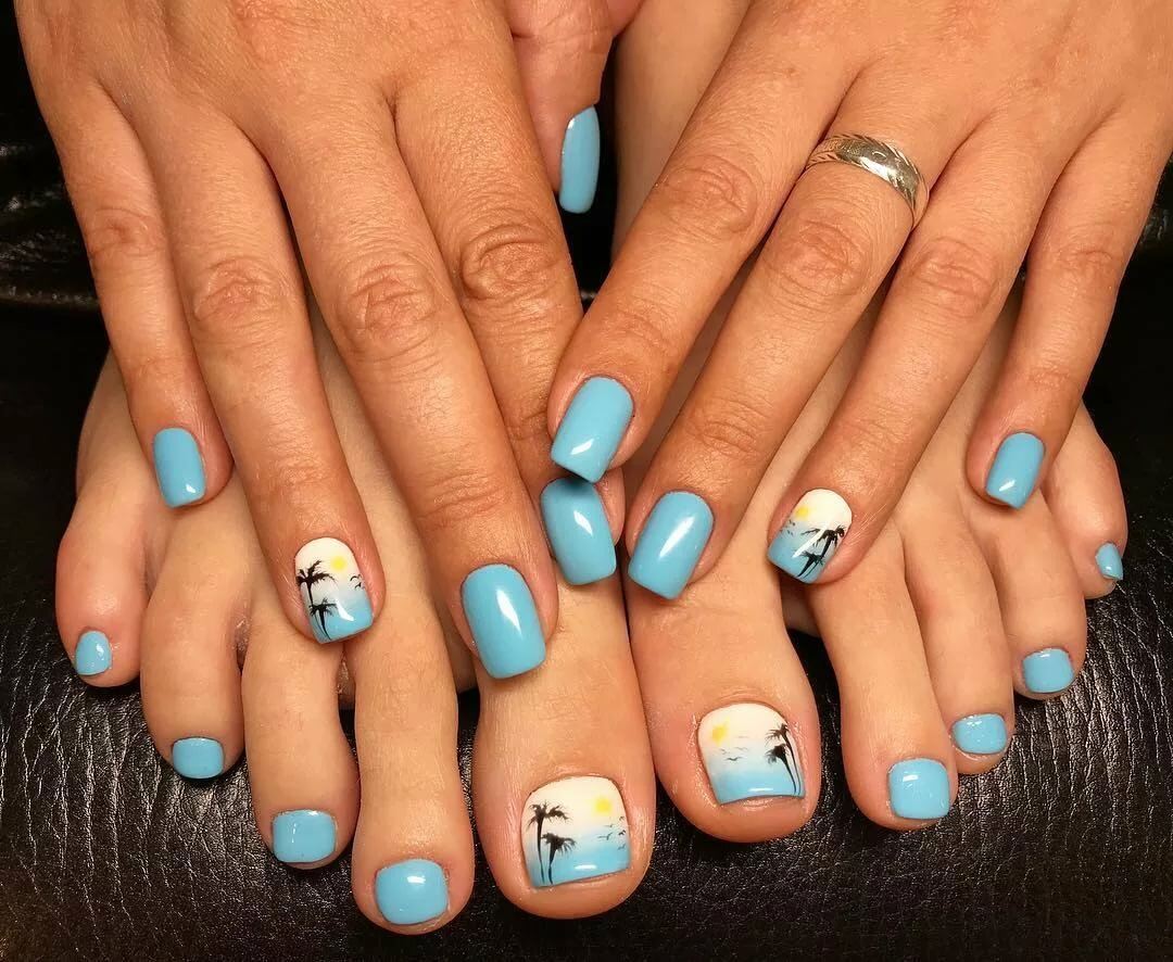 В летний сезон как никогда актуален тематический морской дизайн, который прекрасно дополняет маникюр и педикюр. Череду ракушек, морской берег, солнце на закате, якорь и многое другое можно изобразить от руки. В домашних условиях это будет проще сделать, используя раздвижную конструкцию. И конечно же, чтобы насыщенные оттенки лака не выгорали на солнце, поверх него лучше нанести топовое покрытие. Благодаря ему можно не переживать за привлекательный внешний вид ногтей.