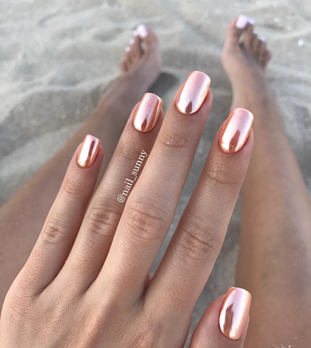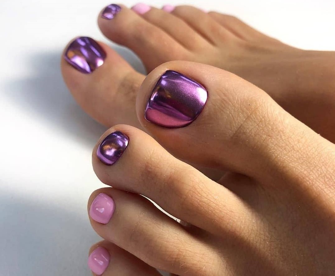 Когда, как не летом, сделать яркий, блестящий дизайн педикюра и маникюра? Несмотря на столь смелое решение, он невероятно популярен в 2023 году. Причем добиться его можно совершенно разными способами. Голографическое покрытие, пожалуй, самый простой, но в то же время эффектный вариант. Его можно сделать самостоятельно в домашних условиях. Для этого понадобится специальный лак с металлизированными частицами. При нанесении создает мягкие переливы, которые роскошно смотрятся на ногтях.