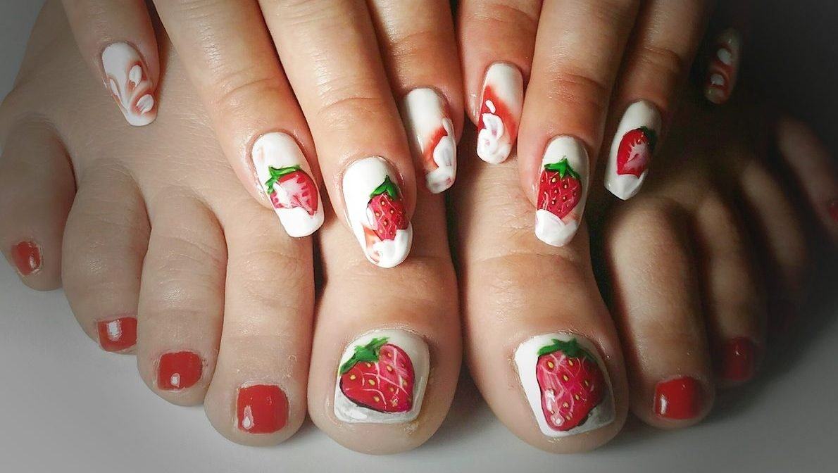 Лето у многих ассоциируется с разнообразием фруктов и ягод. Поэтому неудивительно, что такие рисунки быстро стали изображать на ногтях. Ярко-розовая отделка идеально сочетается с малиновым рисунком. Желтый маникюр и педикюр — идеальная основа для дизайна с лимонами или бананами. Красный лак чаще всего сочетается с рисунком клубники или вишни. На самом деле комбинаций гораздо больше. Поэтому рекомендуем вам обязательно посмотреть подборку идей ниже.