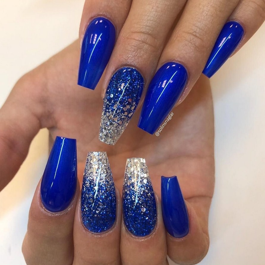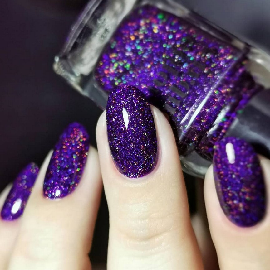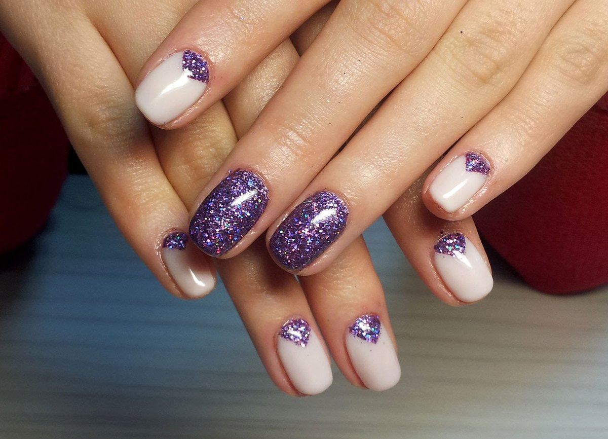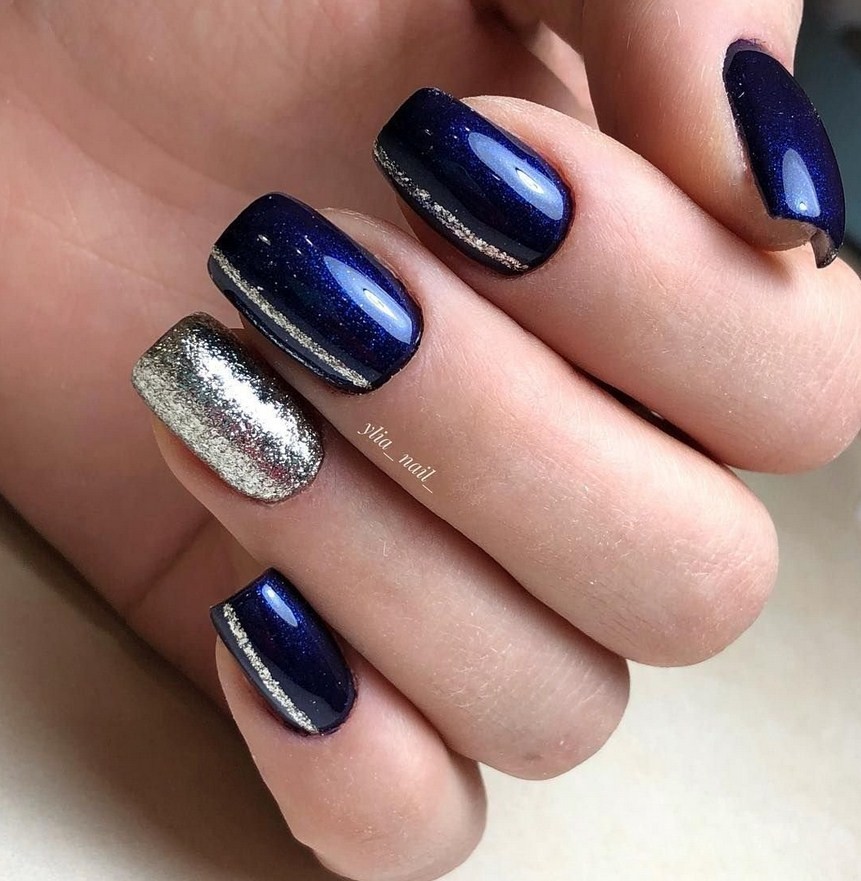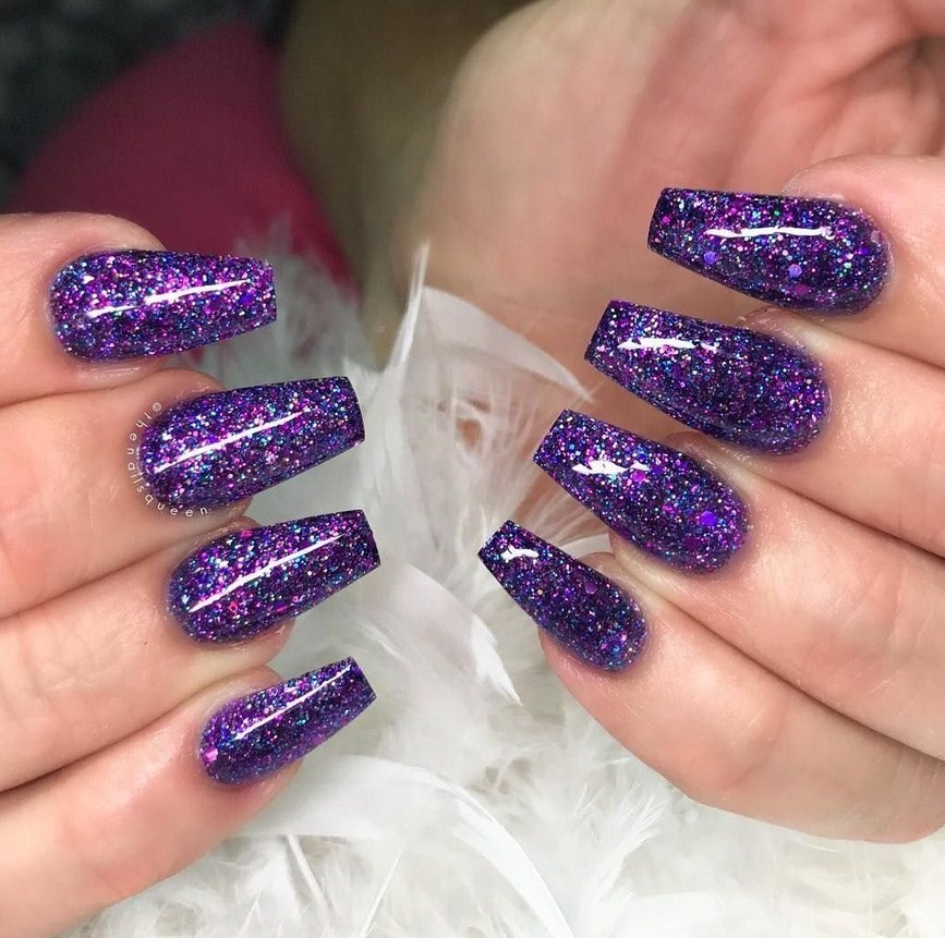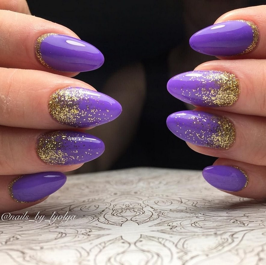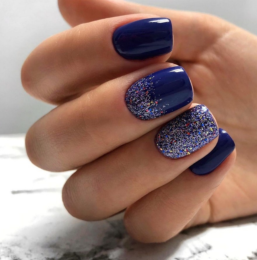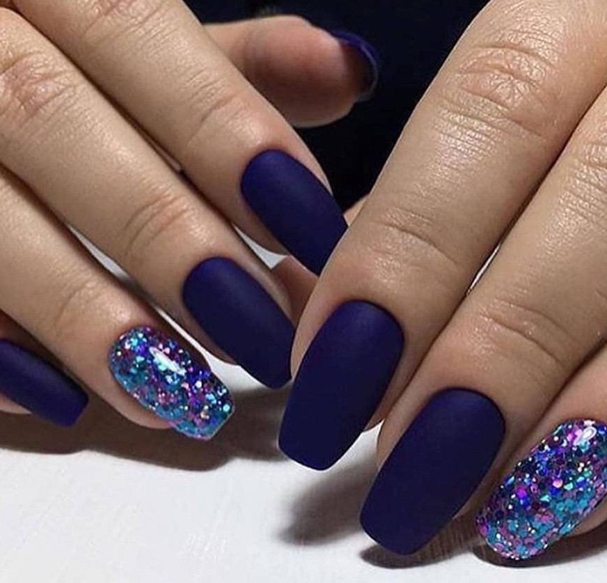 Сияние фиолетовых и ультрамариновых тонов вместе с блёстками – настоящая находка для истинных модниц. Маникюр точно не останется незамеченным, станет ярким акцентом образа.