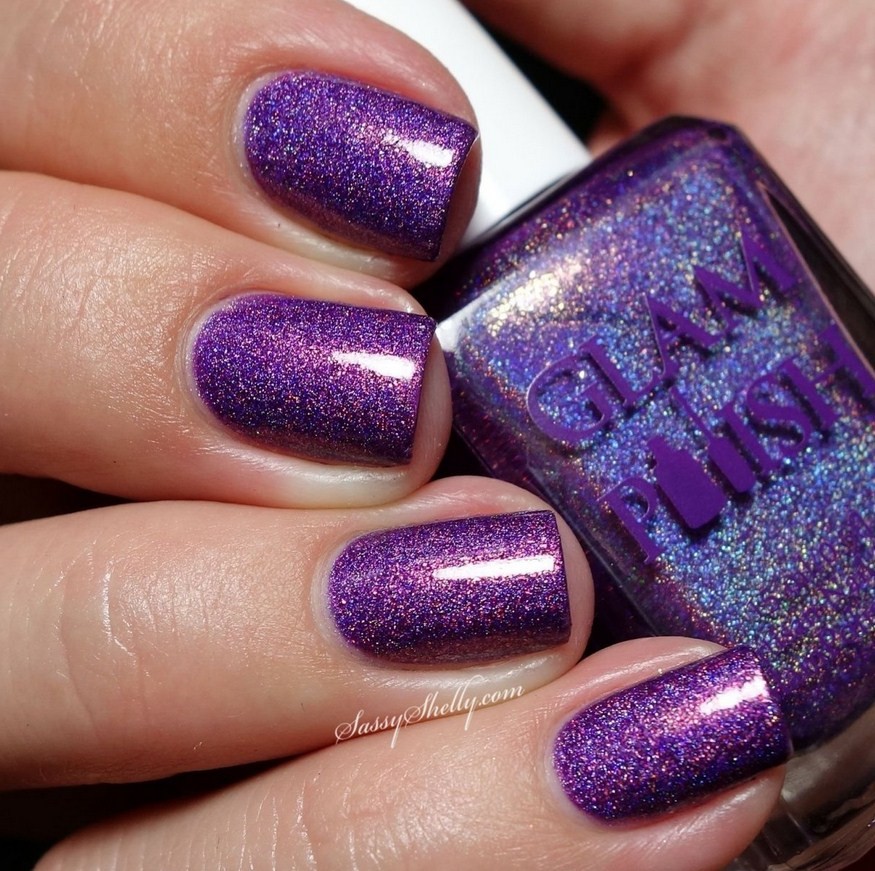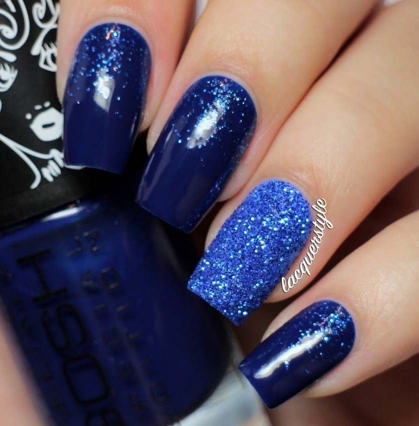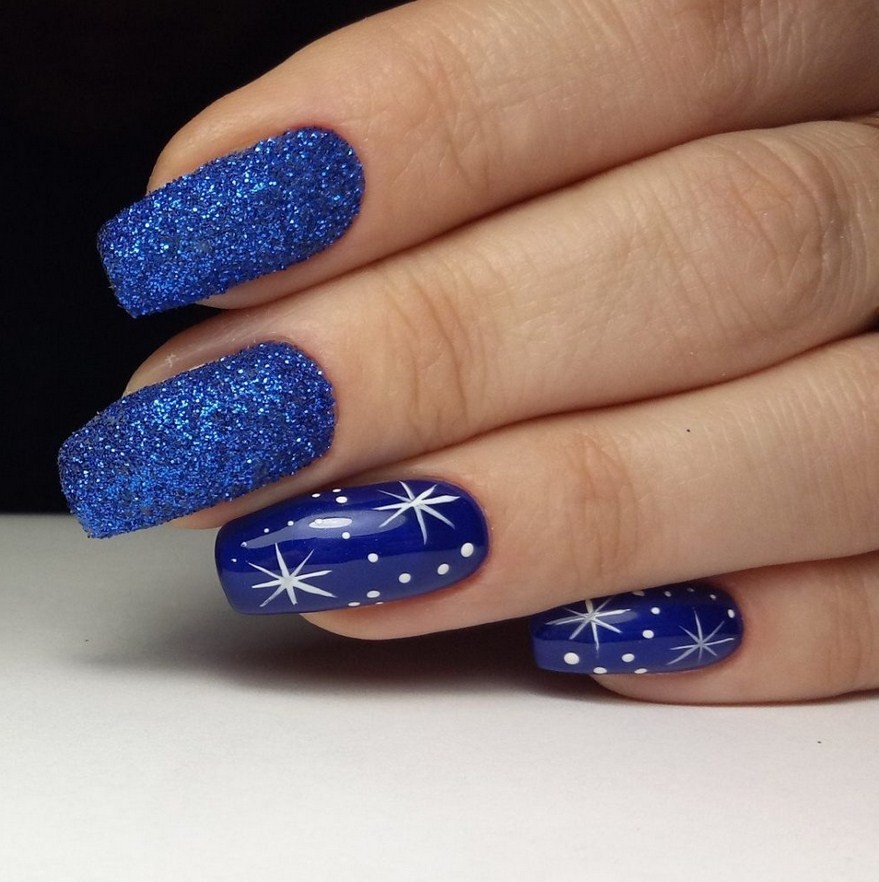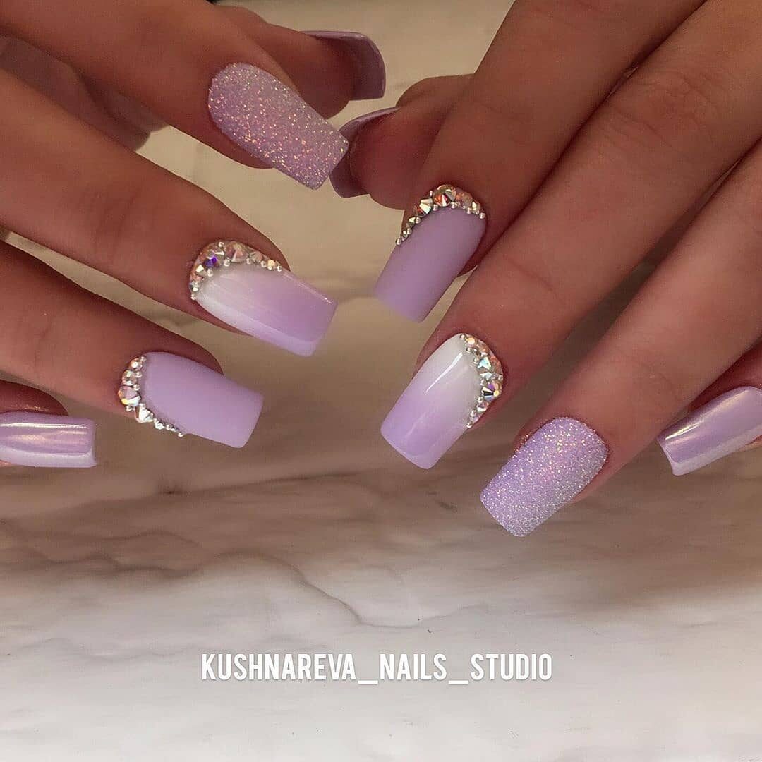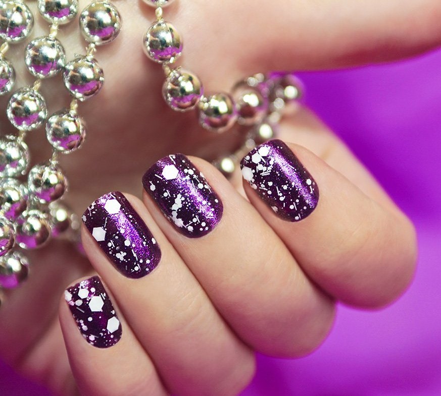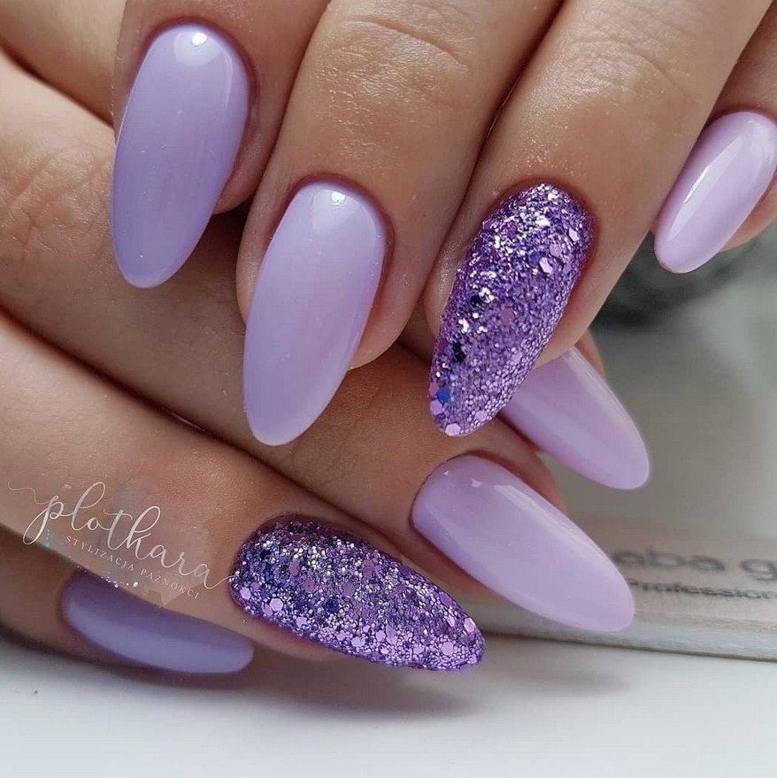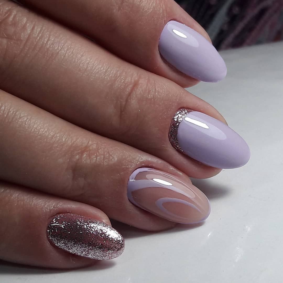 Сияние фиолетовых и ультрамариновых тонов вместе с блёстками – настоящая находка для истинных модниц. Маникюр точно не останется незамеченным, станет ярким акцентом образа.
